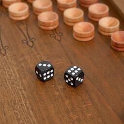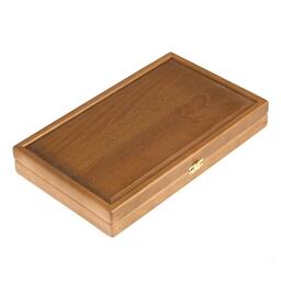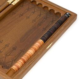 Нарды изготовлены из массива бука, в изделии сохранена фактура и красота дерева. Внешнюю сторону крышки украшает резной фрагмент. На поле нарисованы лучи, выделенные тонировкой. Доска соответствует всем требованиям Федерации спортивных нард.