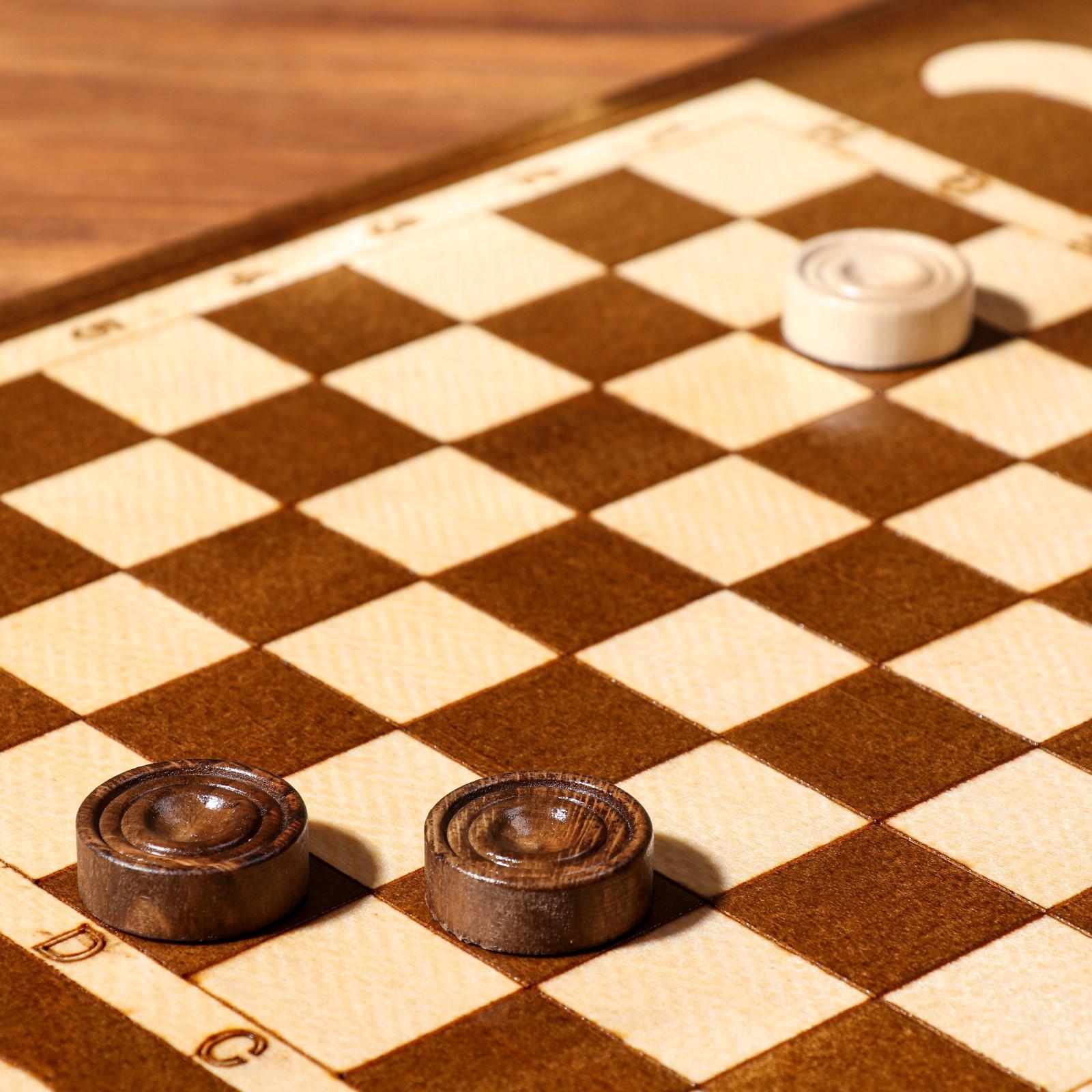 Верхняя внешняя часть доски гладкая украшена узором. На нижней части доски расположено шахматное поле и обрамлено узором. В комплект входят фишки для шашек.