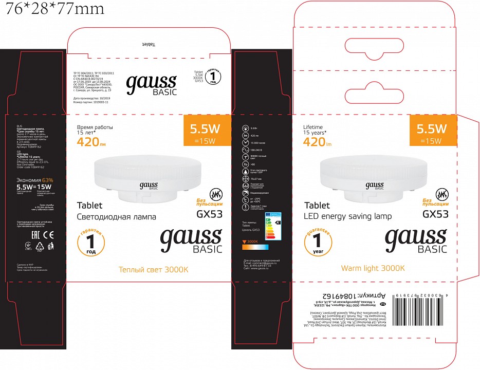 Лампа светодиодная Gauss Basic GX53 5.5Вт 3000K 10849162