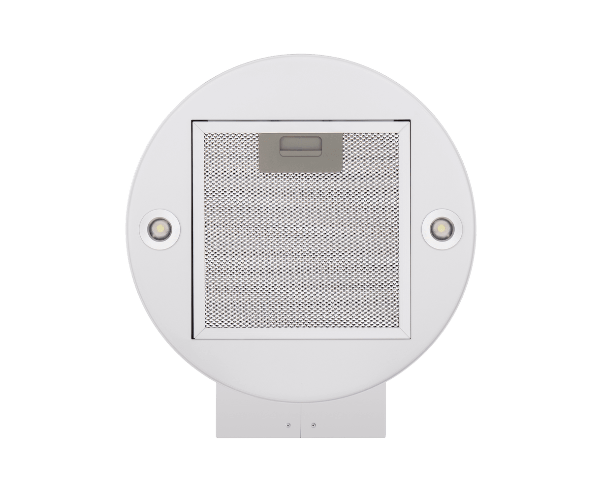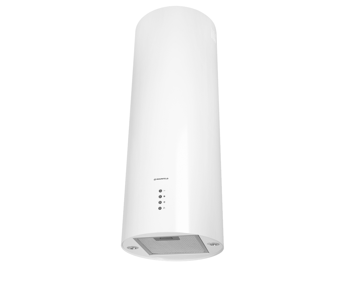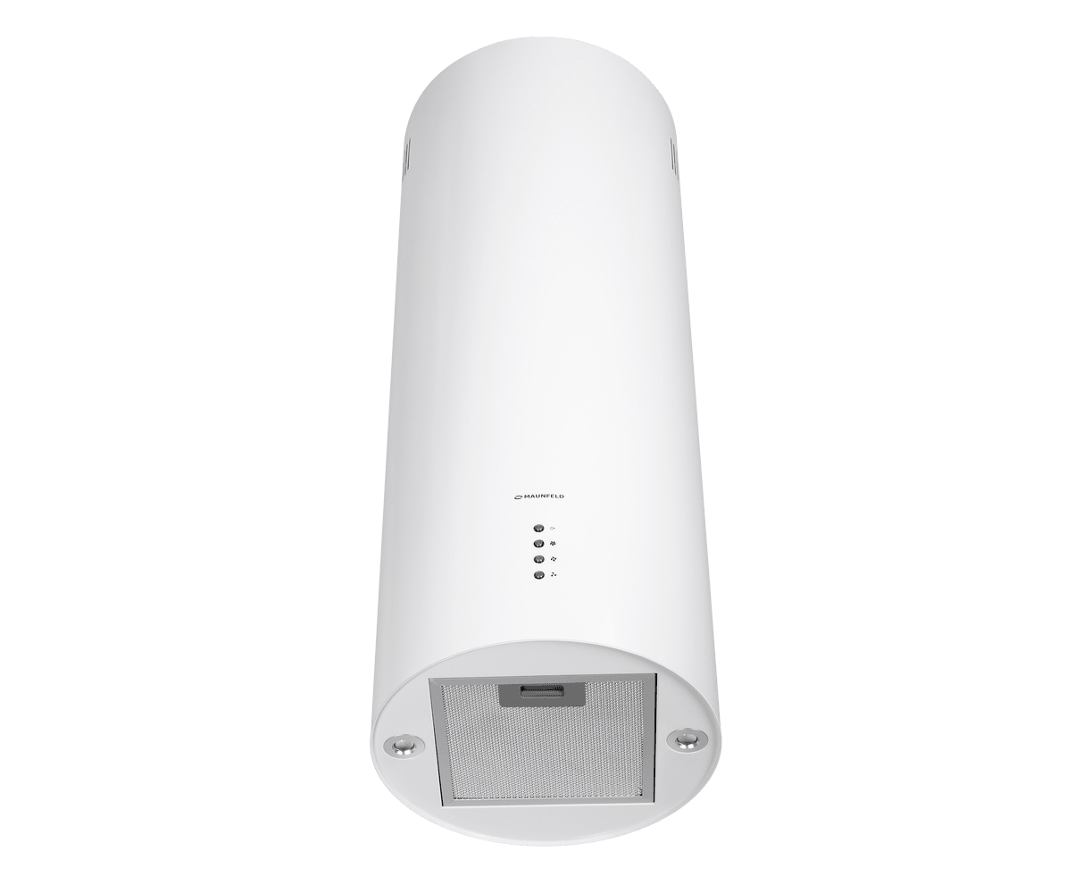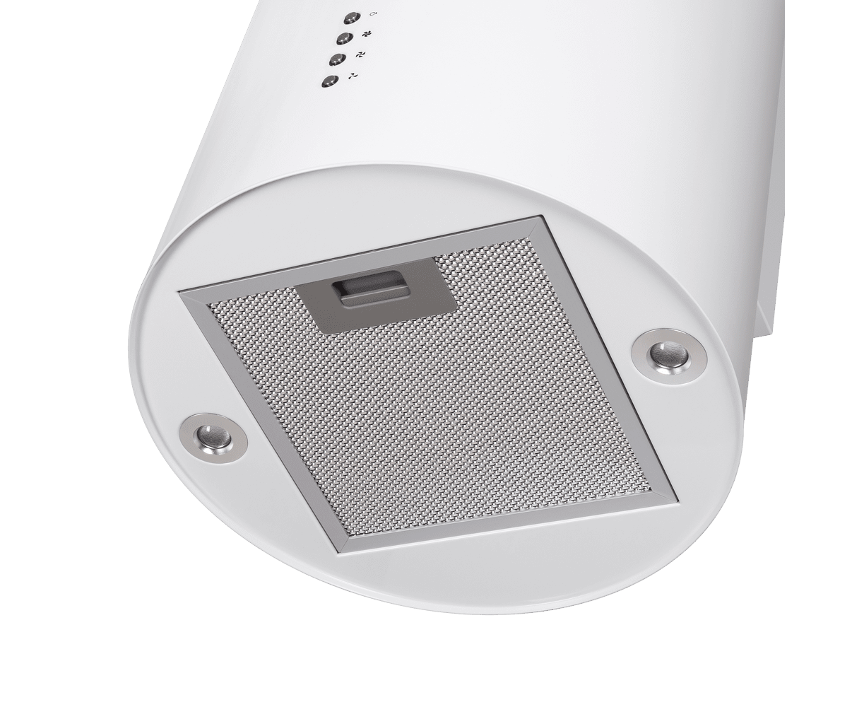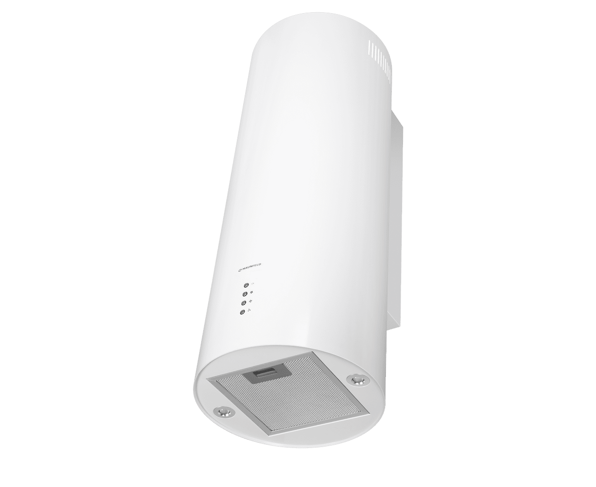 Корпус цилиндрической формы, выполненный из нержавеющей стали с термостойким покрытием белого цвета, устанавливается на стену над поверхностью плиты. Алюминиевый многослойный жироулавливающий фильтр находится в нижнем торце вытяжки.