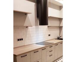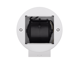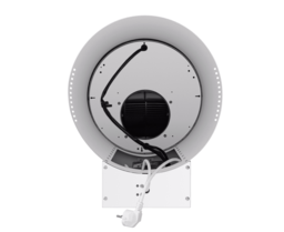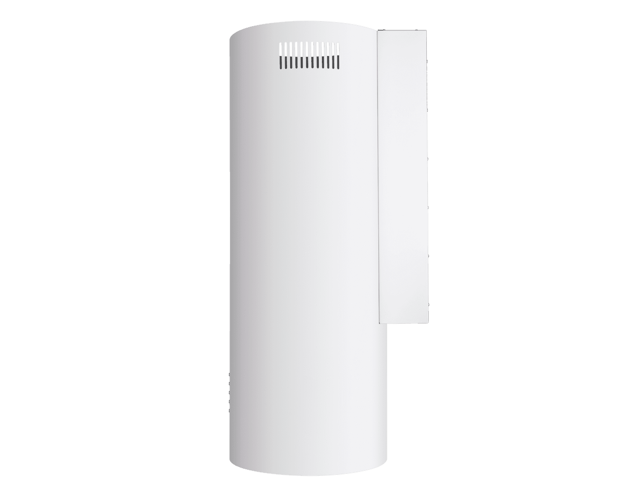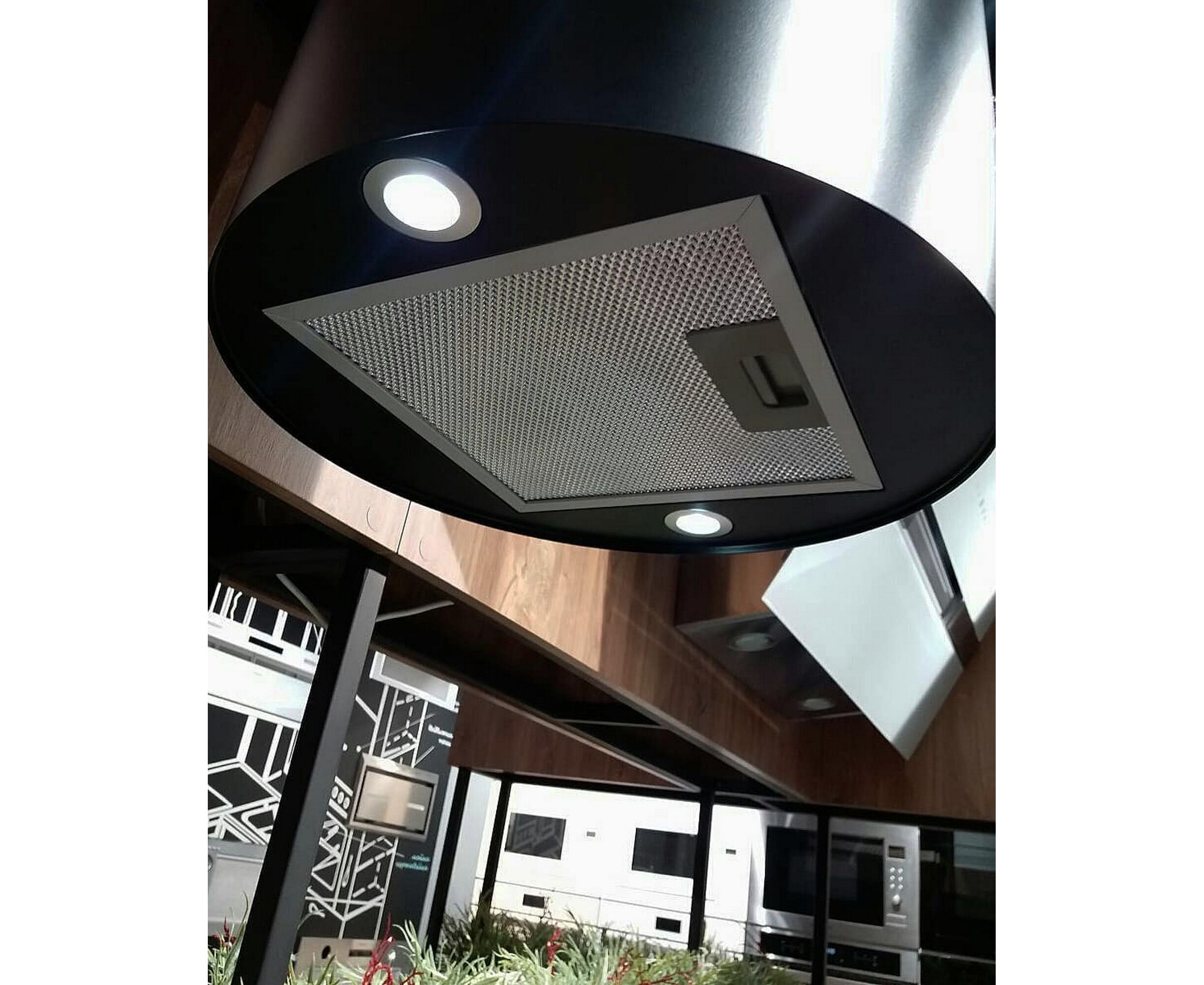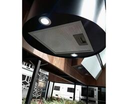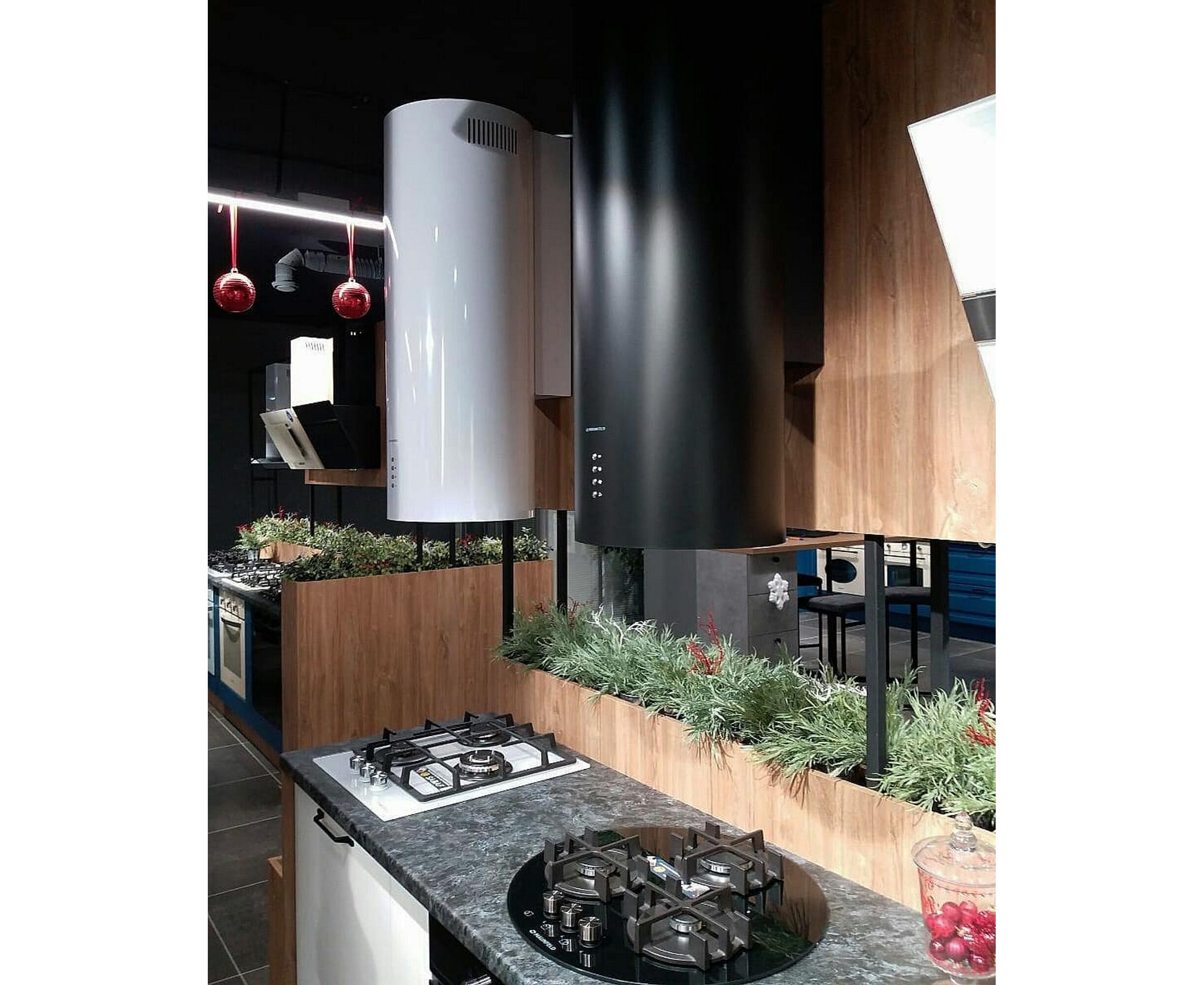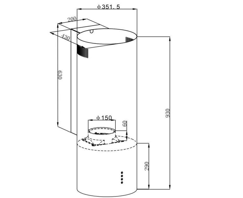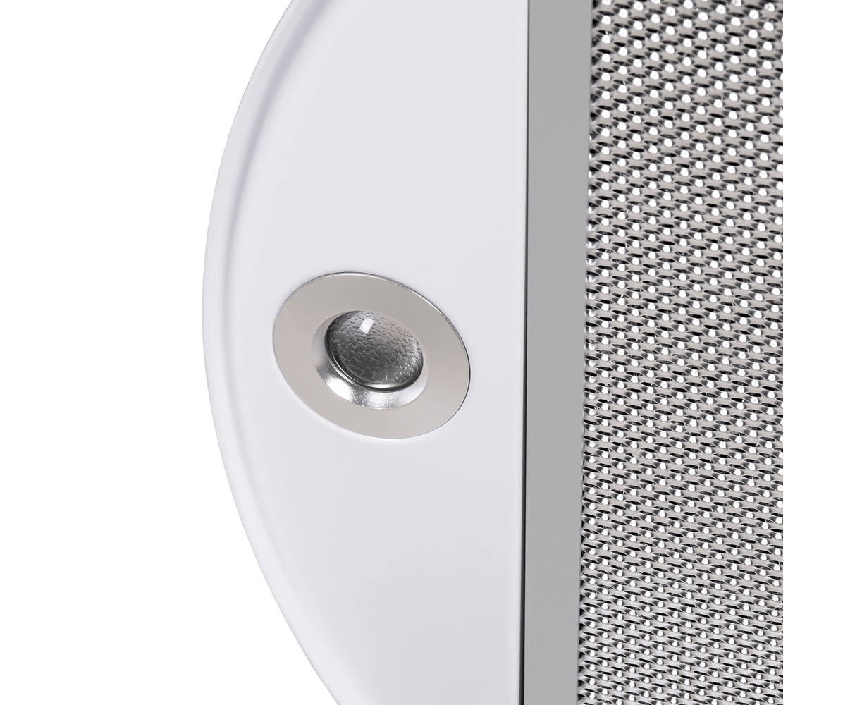 Корпус цилиндрической формы, выполненный из нержавеющей стали с термостойким покрытием белого цвета, устанавливается на стену над поверхностью плиты. Алюминиевый многослойный жироулавливающий фильтр находится в нижнем торце вытяжки.