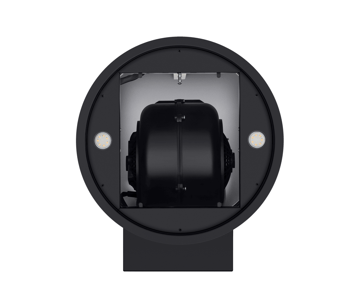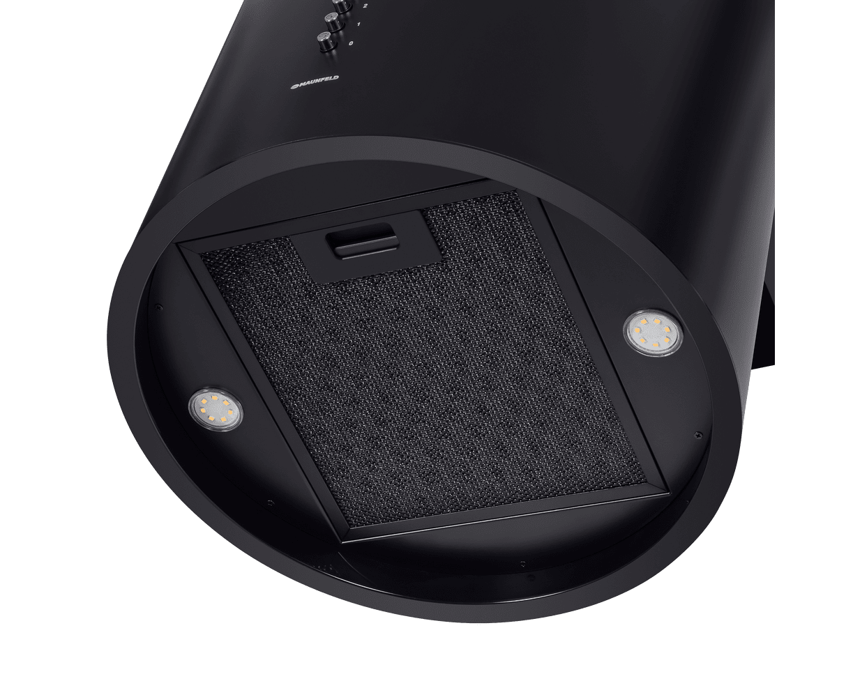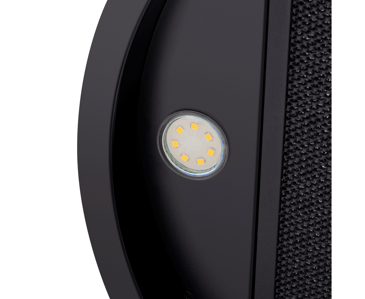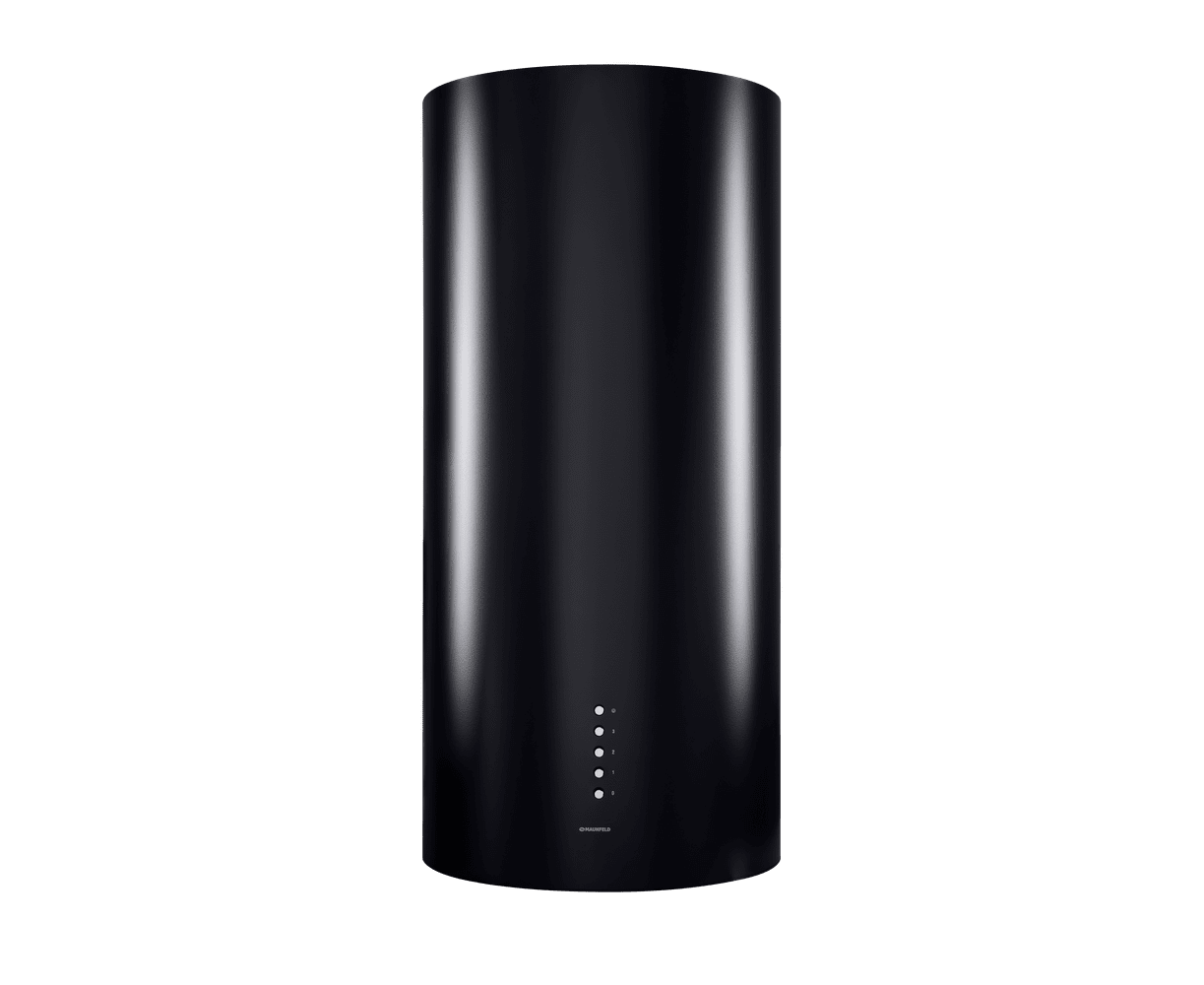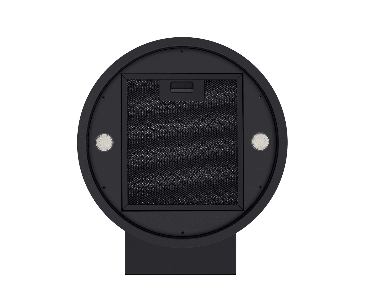 Корпус цилиндрической формы, выполненный из нержавеющей стали с термостойким покрытием черного цвета, монтируется на стене над варочной поверхностью. В нижнем торце вытяжки расположен специальный многослойный жироулавливающий фильтр черного цвета.