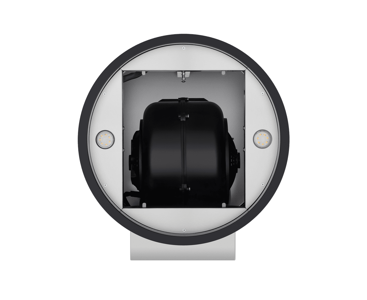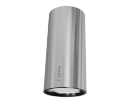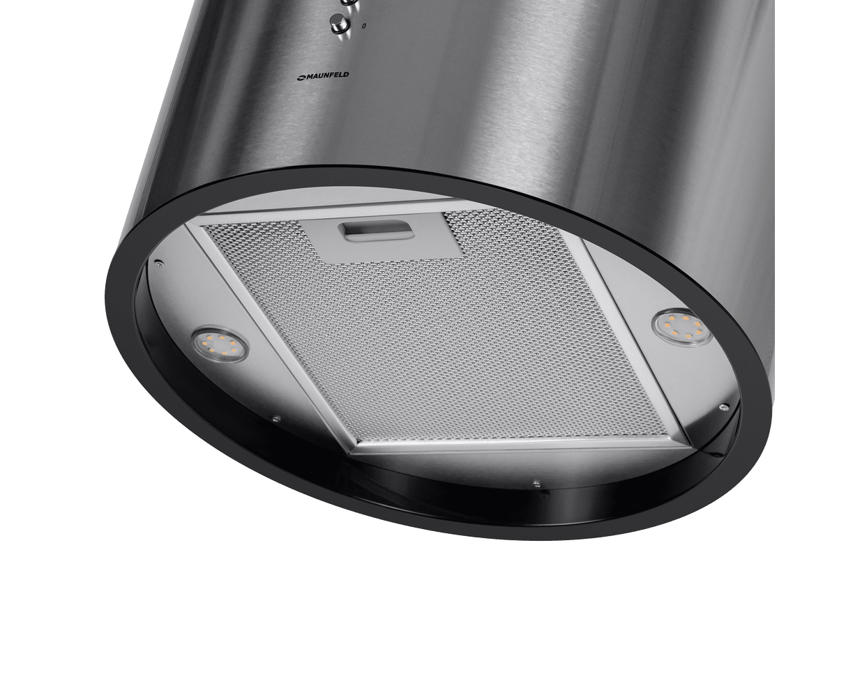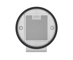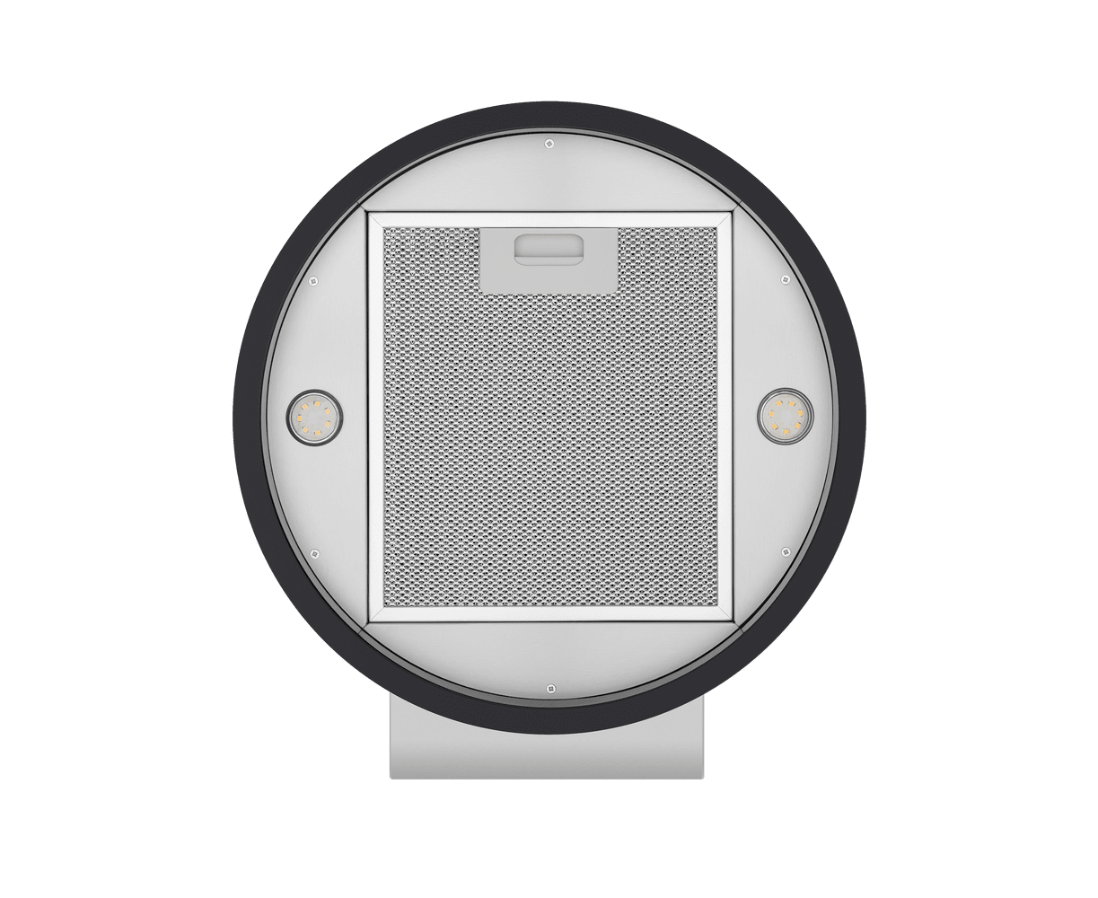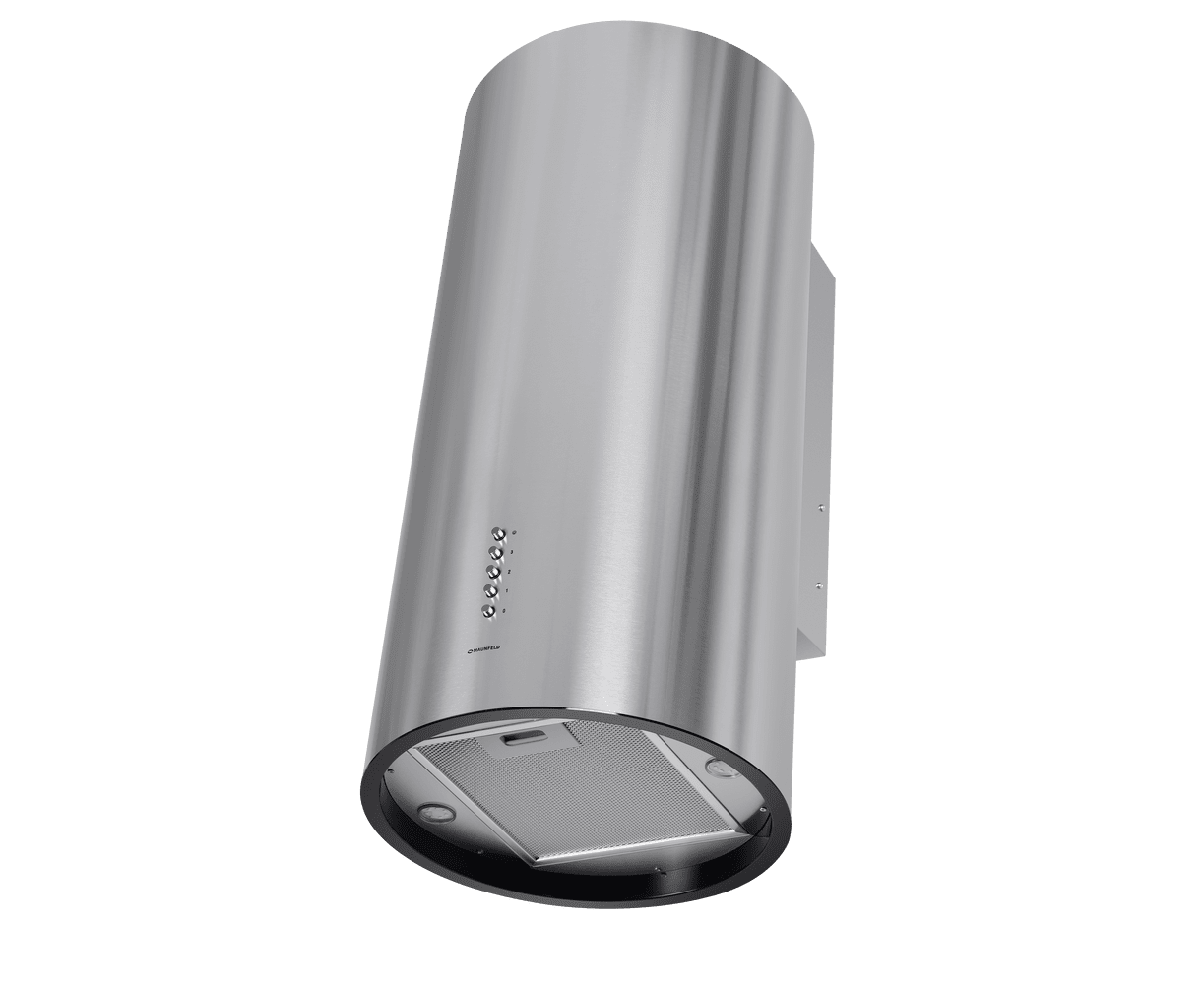 Корпус цилиндрической формы, выполненный из нержавеющей стали с термостойким покрытием черного цвета, монтируется на стене над варочной поверхностью. В нижнем торце вытяжки расположен специальный многослойный жироулавливающий фильтр черного цвета.