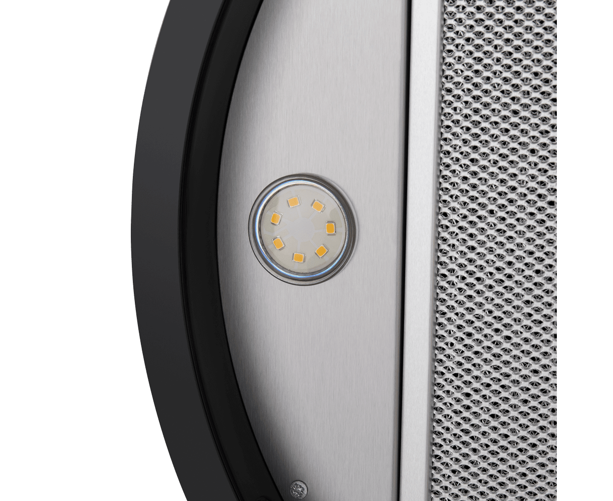 Удобное кнопочное управление вытяжкой позволяет установить один из 3-х режимов скорости вентилятора и включить 2 светодиодных элемента (2,2 Вт), расположенных по бокам фильтра.