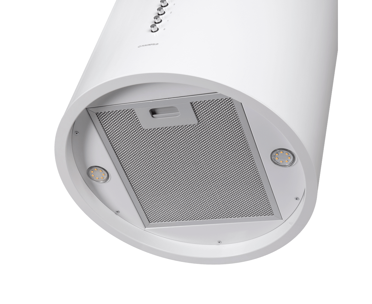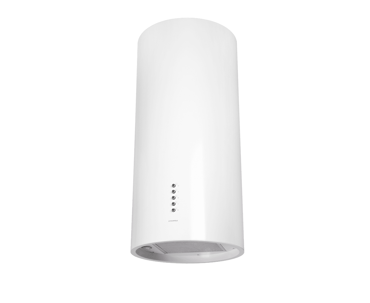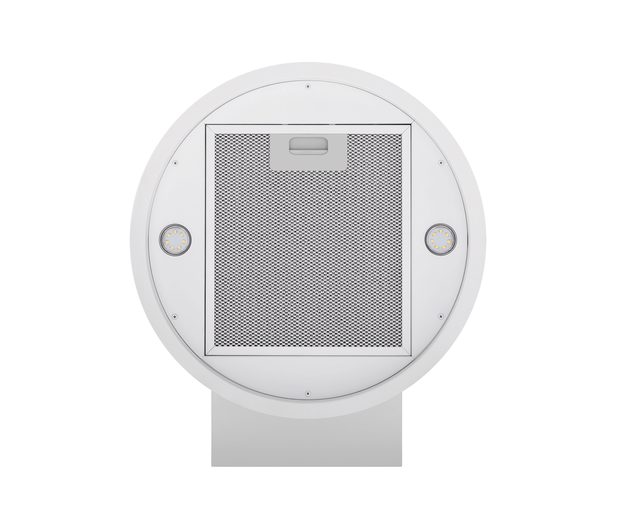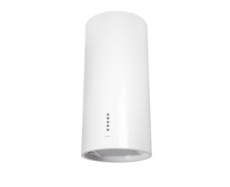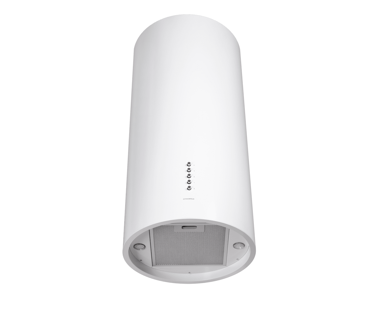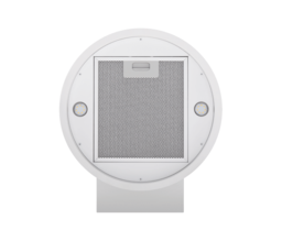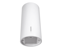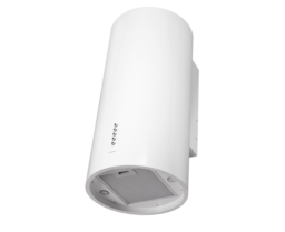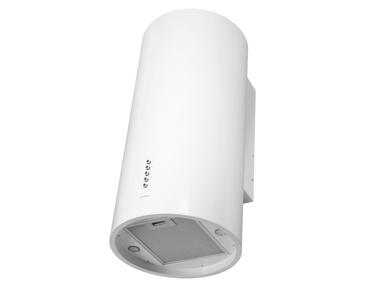 Корпус цилиндрической формы, выполненный из нержавеющей стали с термостойким покрытием белого цвета, монтируется на стене над варочной поверхностью. В нижнем торце вытяжки расположен специальный многослойный жироулавливающий фильтр белого цвета.