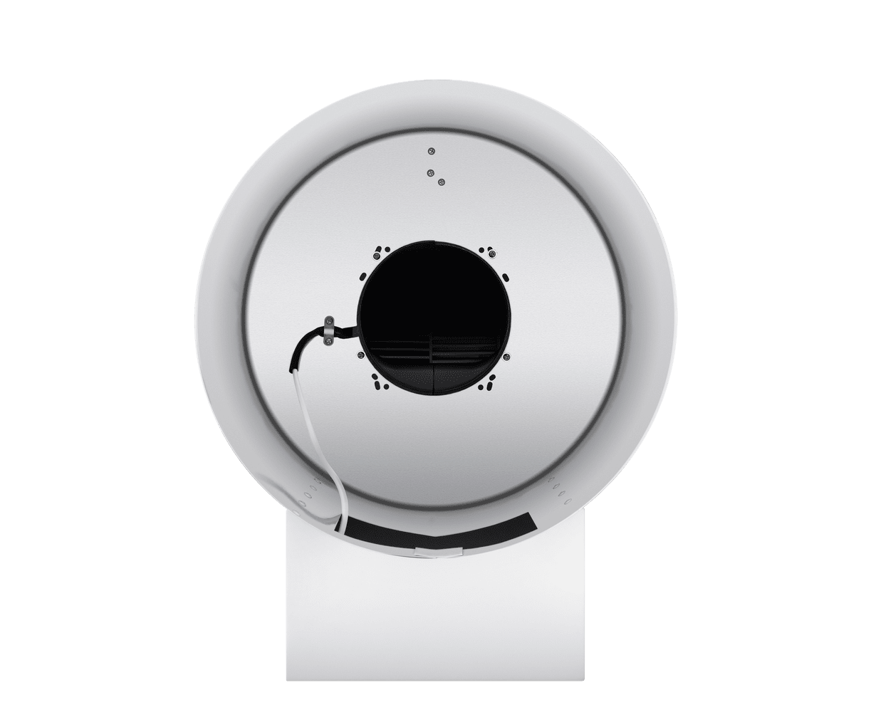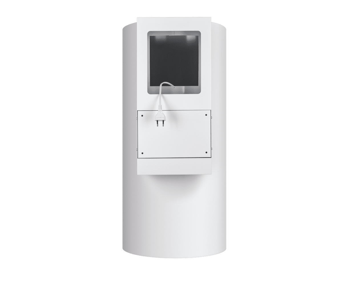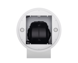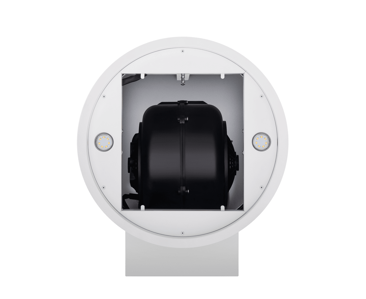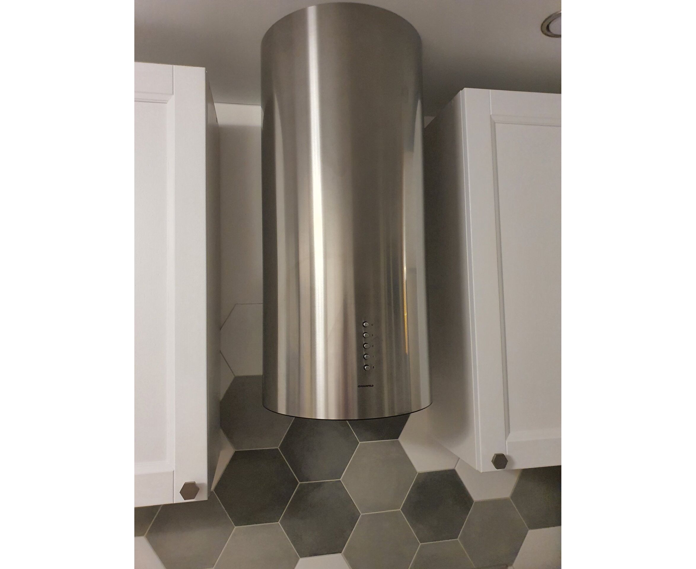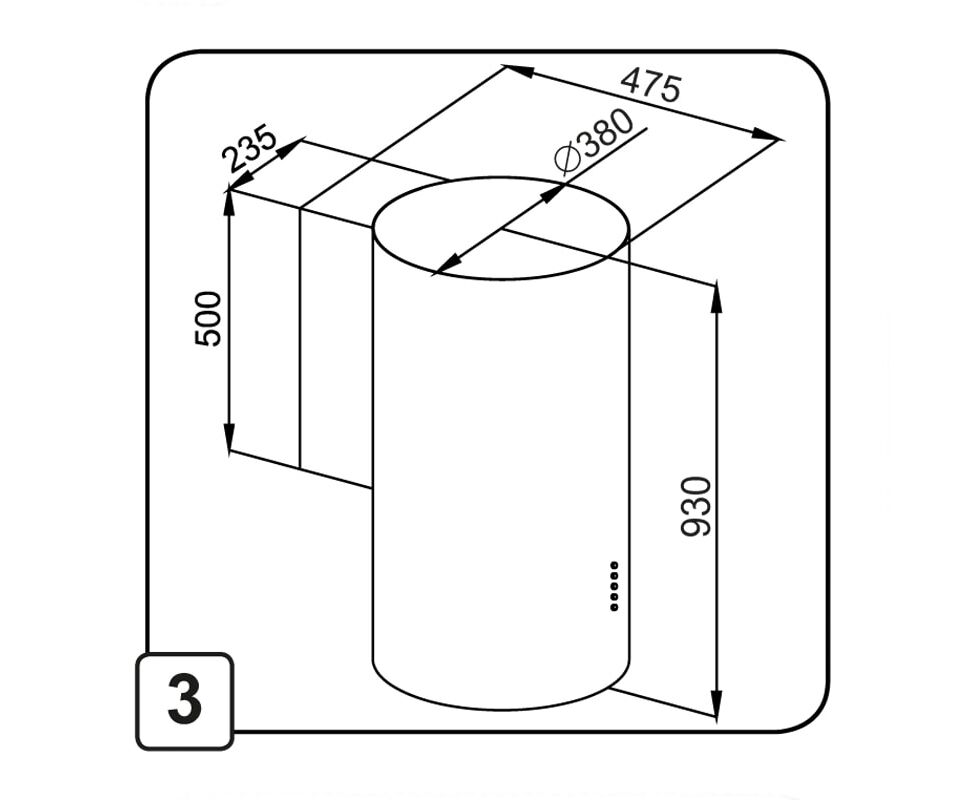 Корпус цилиндрической формы, выполненный из нержавеющей стали с термостойким покрытием белого цвета, монтируется на стене над варочной поверхностью. В нижнем торце вытяжки расположен специальный многослойный жироулавливающий фильтр белого цвета.