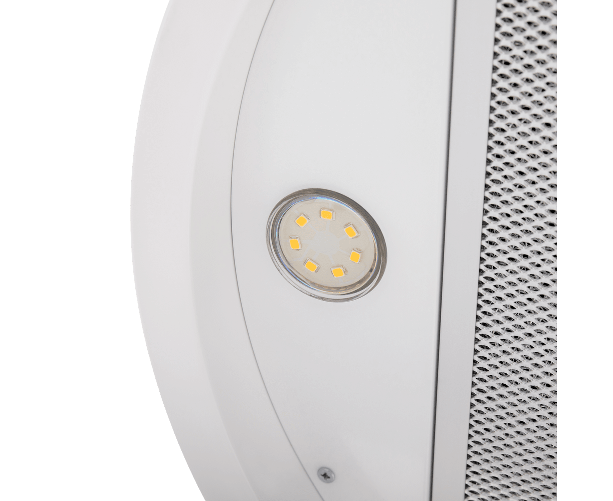 Удобное кнопочное управление вытяжкой позволяет установить один из 3-х режимов скорости вентилятора и включить 2 светодиодных элемента (2,2 Вт), расположенных по бокам фильтра.