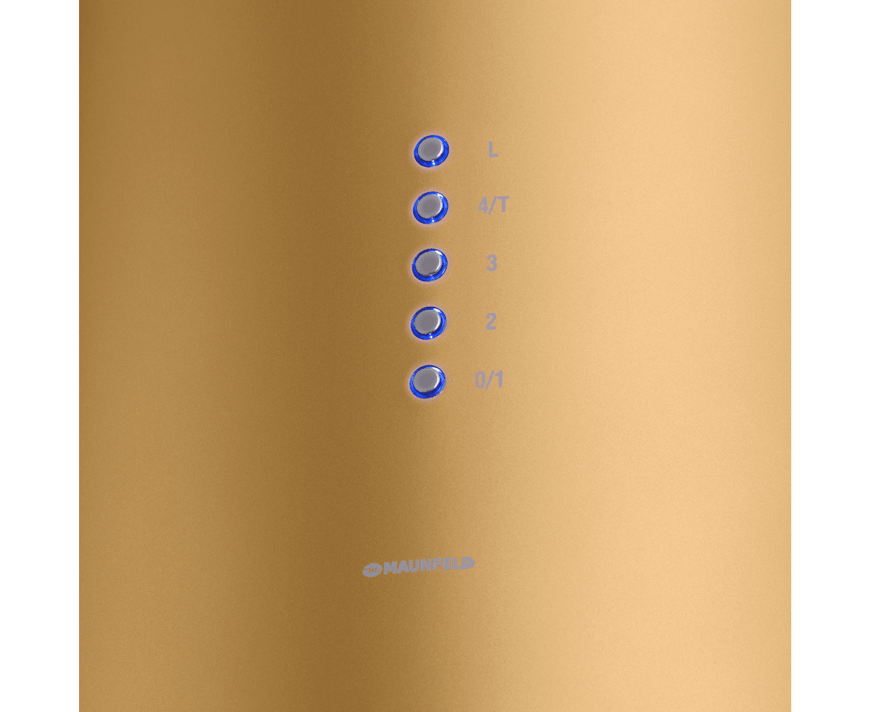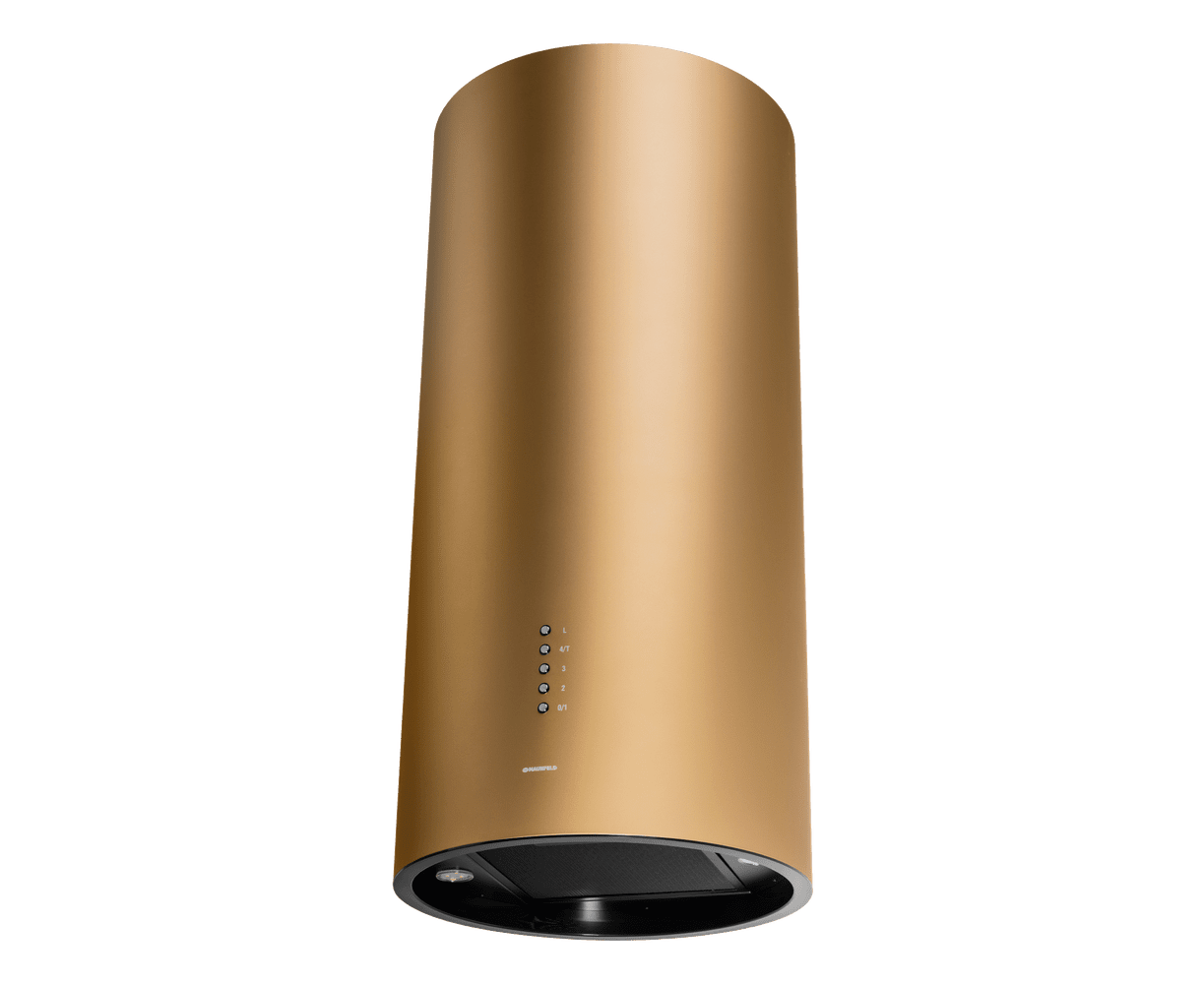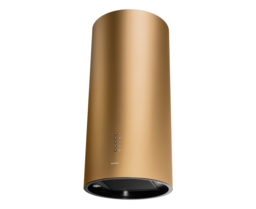 Уникальная вытяжка благодаря неординарному исполнению подчеркнет неповторимый дизайн вашей большой кухни (до 40 кв.м). В модели реализованы две возможности эксплуатации: режим прямого отвода загрязненного воздуха в вентиляционную шахту или режим рециркуляции воздушных масс и их очистки с помощью сменных угольных фильтров.Корпус цилиндрической формы, сделанный из нержавеющей стали с термостойким покрытием цвета матового золота, монтируется на стену над варочной поверхностью. Нижний торец вытяжки выполнен в черном акцентном цвете. Специальный многослойный жироулавливающий фильтр легко снимается и полностью разбирается, что сильно упрощает его чистку.Электронное управление с подсветкой позволит выбрать один из 4-х режимов работы вентилятора, установить таймер и включить 2 светодиодные лампочки, расположенные по бокам от фильтра.Мощность мотора составляет 260 Вт. Максимальная производительность вытяжки достигает 1000 м3/ч. Тихая работа и высокая эффективность вытяжки обеспечиваются периметральным принципом втягивания воздуха и особой конструкцией. Уровень шума при самой высокой скорости работы всего 52 Дб.