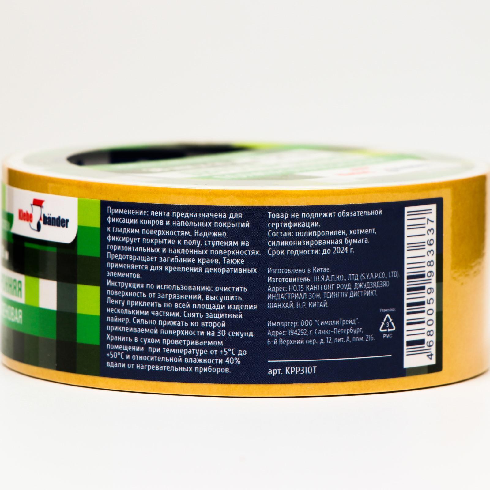 Двусторонняя лента с липким слоем полипропиленовая 38мм х 10 м. Лента предназначена для фиксации ковров и напольных покрытий к гладким поверхностям. Надежно фиксирует покрытие к полу, ступням на горизонтальных и наклонных поверхностях. Предотвращает загибание краев. Также применяется для крепления декоративных элементов.