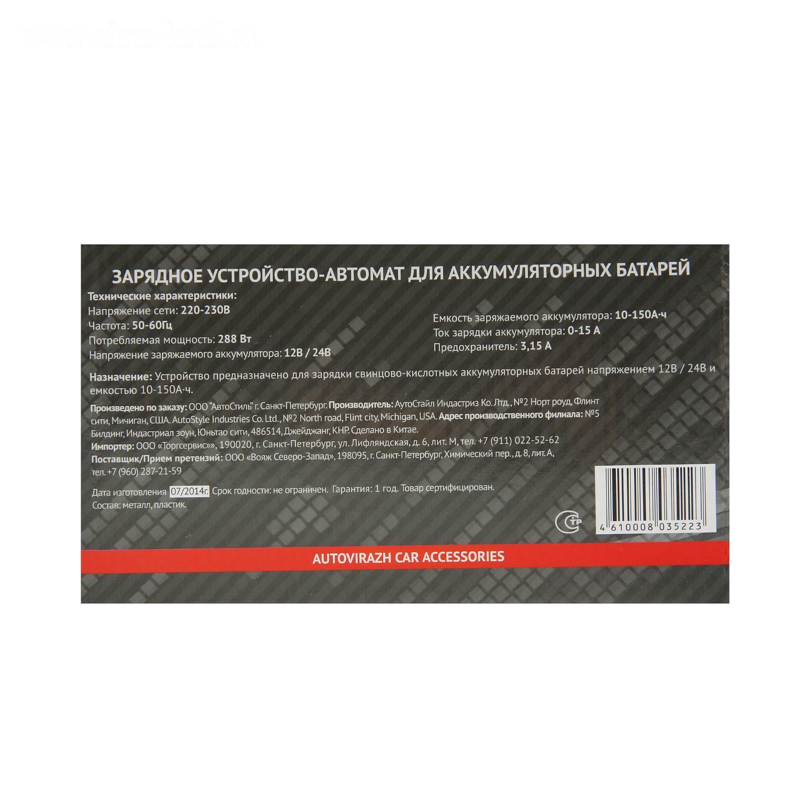 Зарядное устройство АКБ Autovirazh AV-161006, авт, 0-15 А, до 150 Ач, 12/24 В