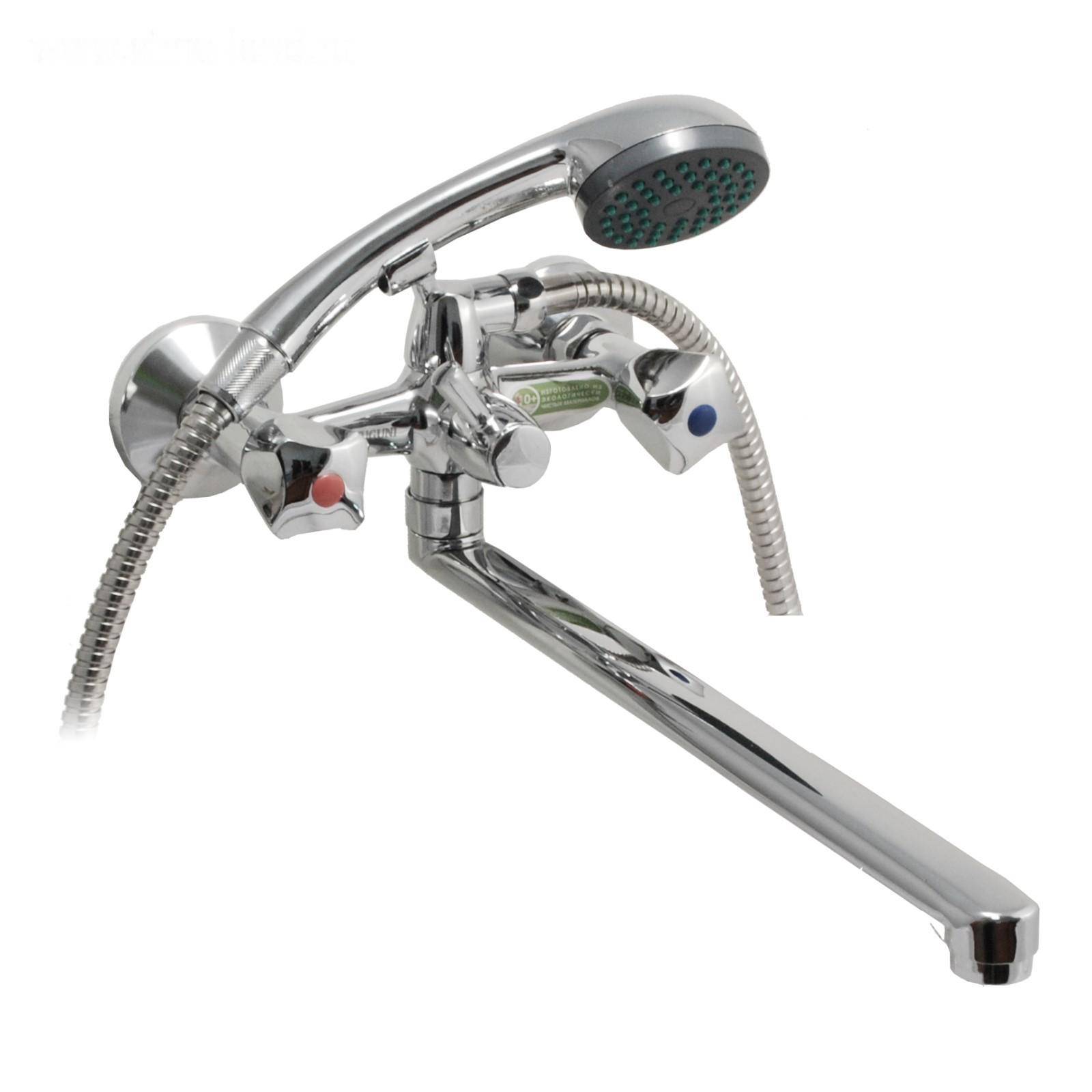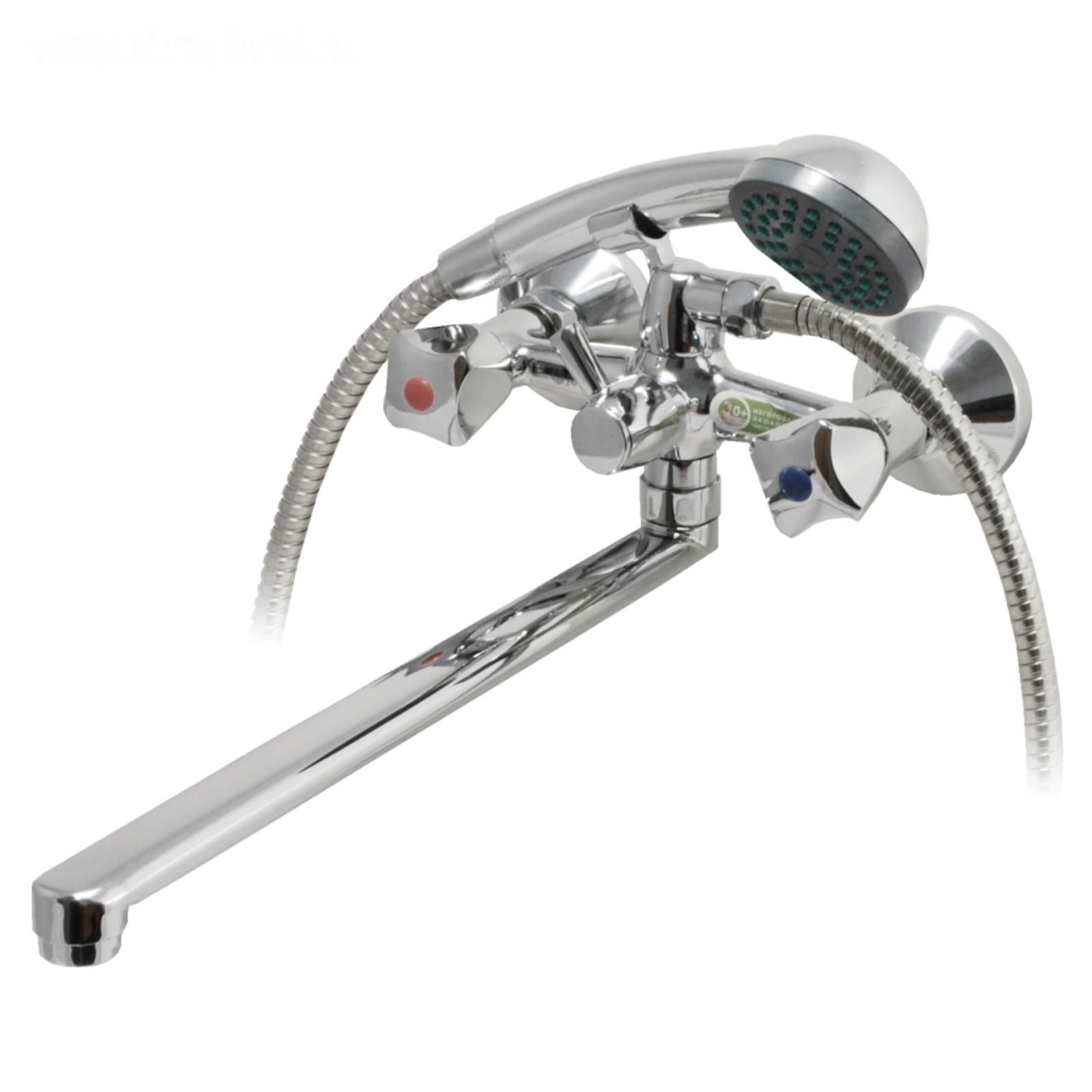 Смеситель ванно-душевой двуручный Juguni JGN0130/B, с металлическим шлангом, хром.лейкой, кран-букса резина, хром.маховики, L-излив