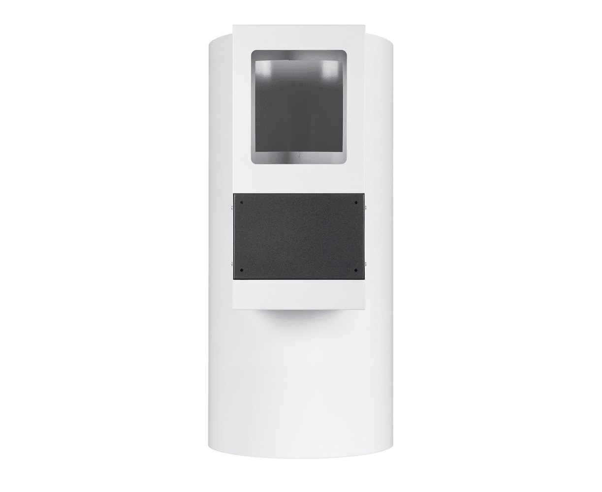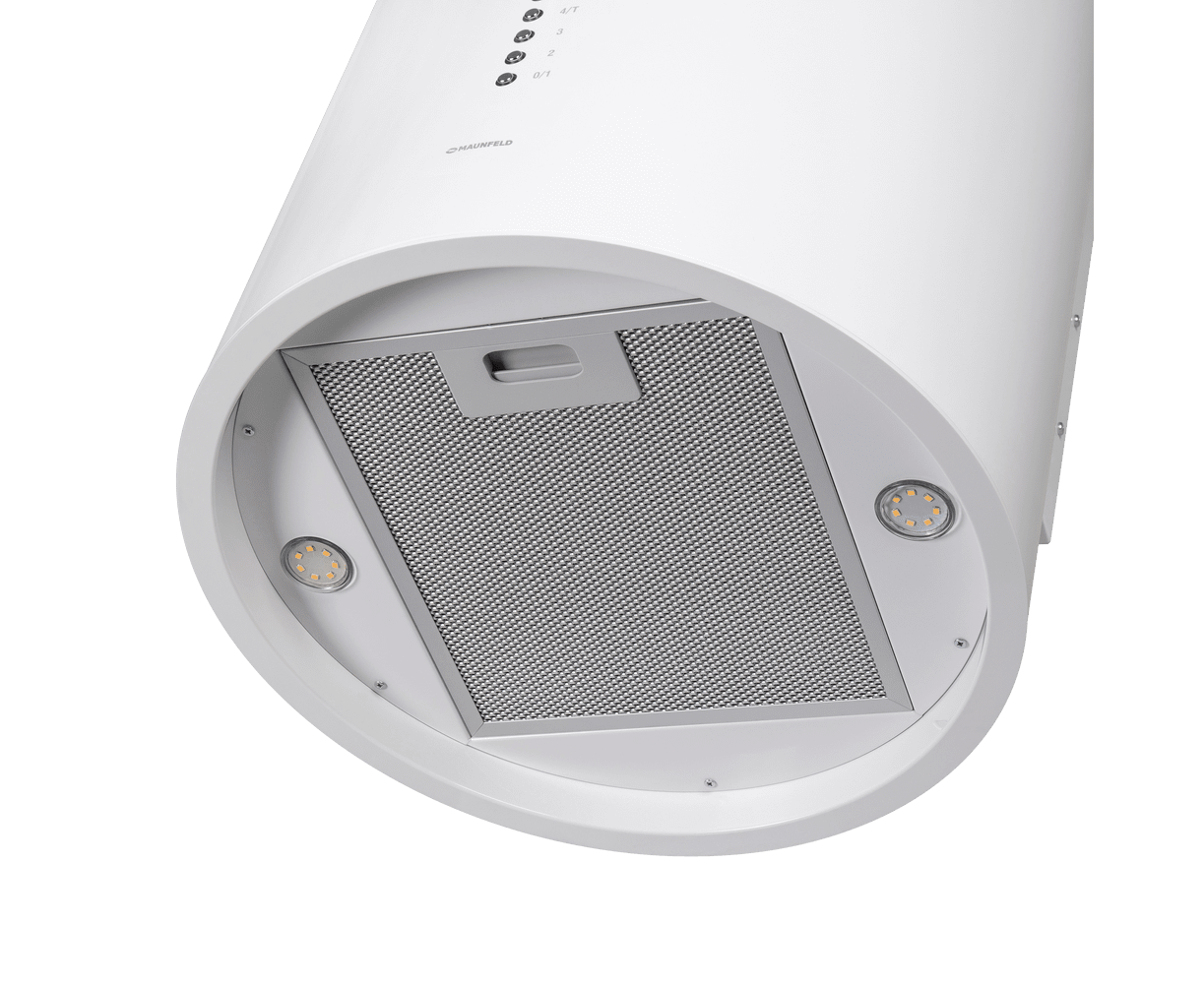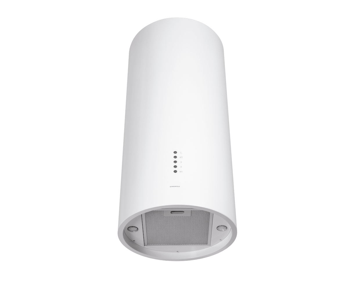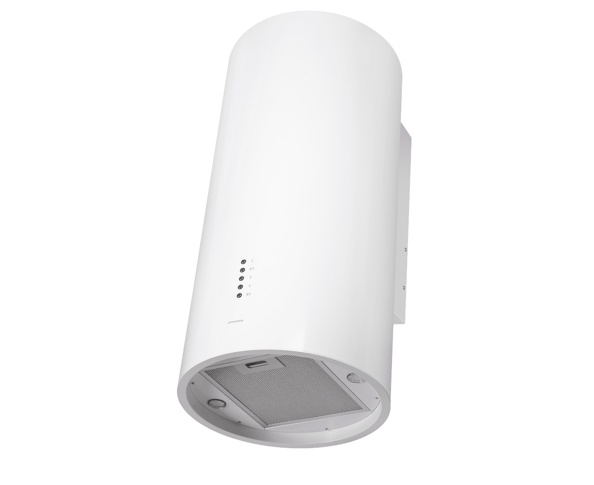 Корпус цилиндрической формы, сделанный из нержавеющей стали с термостойким матовым покрытием белого цвета, монтируется на стену над варочной поверхностью. Специальный многослойный жироулавливающий алюминиевый фильтр, расположенный в нижнем торце, легко снимается и полностью разбирается, что сильно упрощает его чистку.