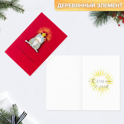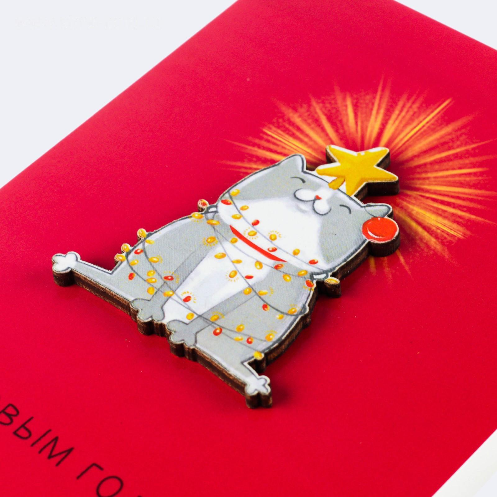 Открытка с деревянным элементом «С Новым годом!» котик, 10 × 15 см