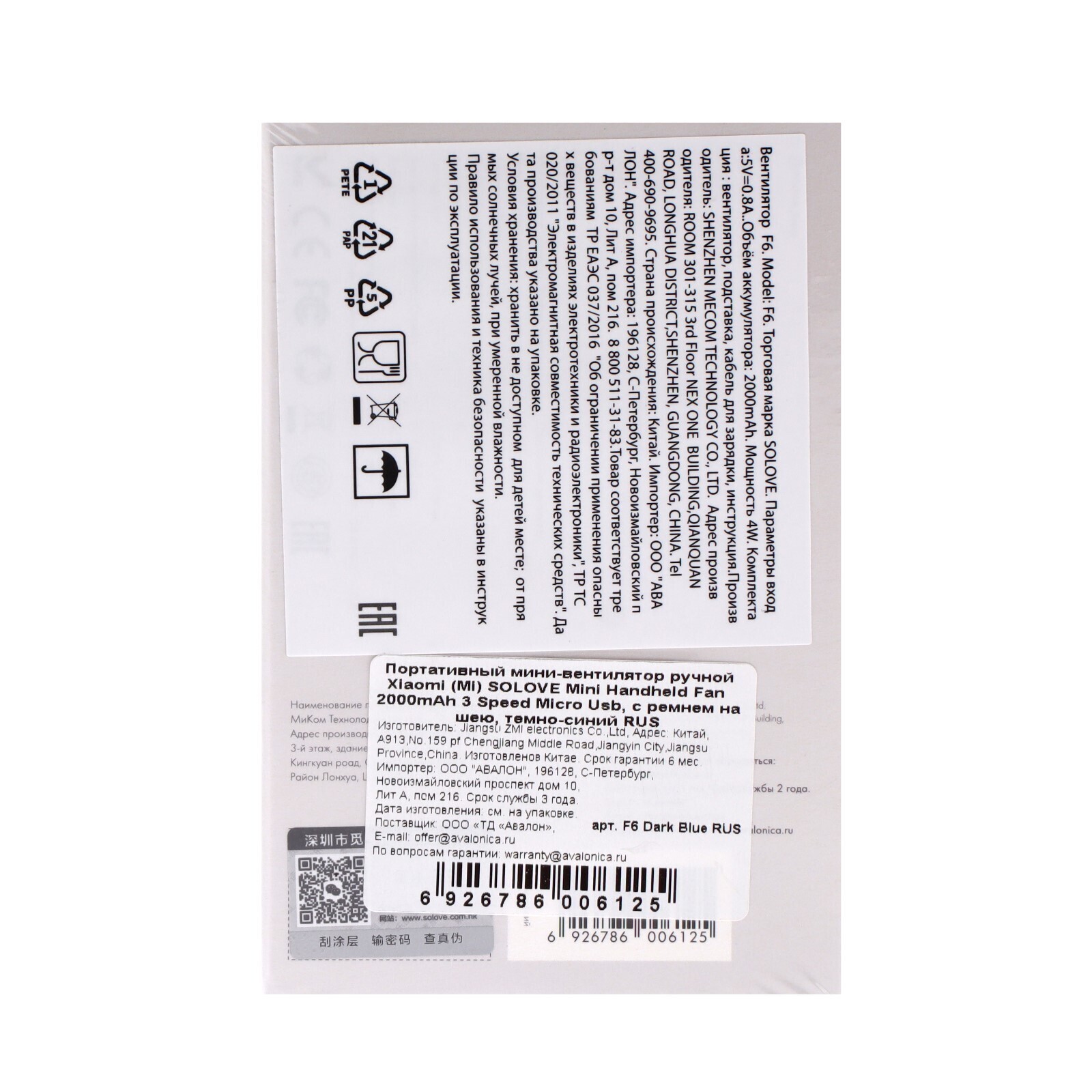 Портативный вентилятор Xiaomi Solove F6, ремешок, 3 скорости, Type-C, 2000 мАч, синий