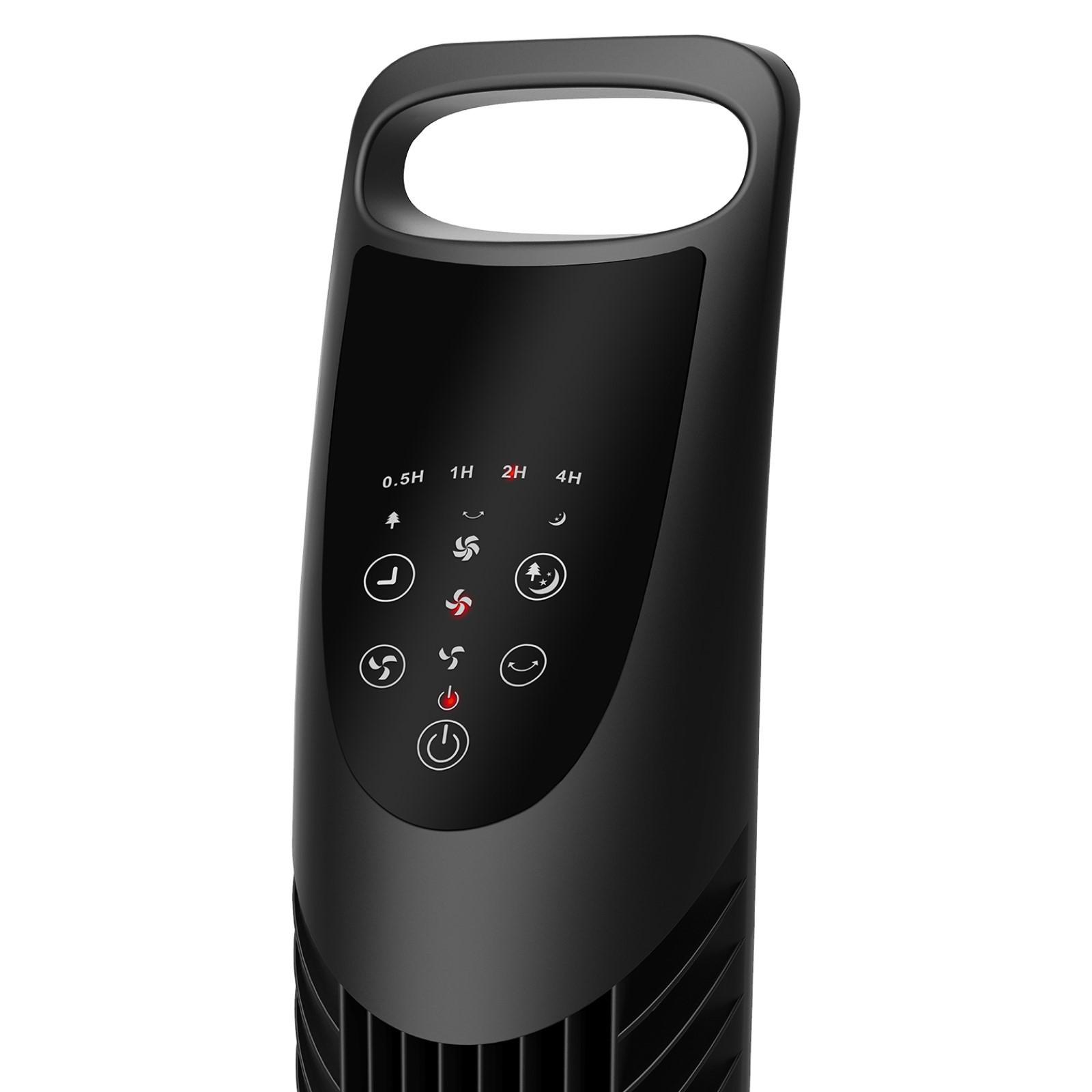 Вентилятор колонный высотой 90 см. — достойный выбор. Сочетание мощности, компактности и лаконичного дизайна позволят устройству вписаться в любой современный интерьер. Модель оснащена 3 скоростными режимами и 3 авторежимами, поэтому вы можете легко настраивать мощность воздушного потока по собственному усмотрению. Благодаря надежному основанию и роторной конструкции лопастей, вентилятор не теряет устойчивость даже при высокой скорости вращения лопастей. Электронная панель управления оборудована LED индикацией выбранной мощности, поэтому даже в темноте вы будете знать, какая из скоростей в данный момент включена. Компактный пульт ДУ и таймер с диапазоном от 0,5 до 7,5 часов, полностью избавят от постоянной беготни для внесения изменений в режимах работы модели. Для удобства переноски вентилятор имеет компактную ручку.