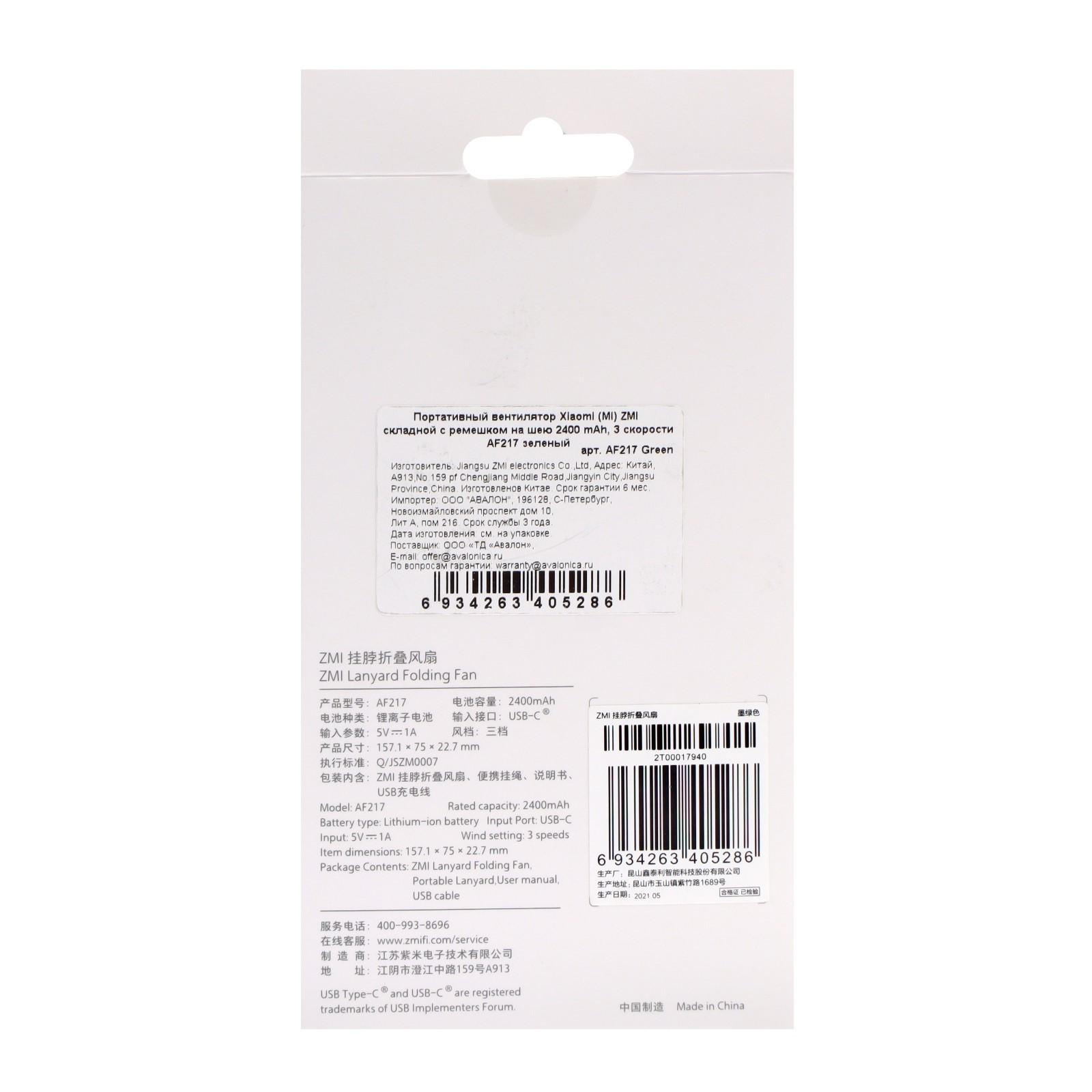 Портативный вентилятор Xiaomi ZMI AF217, ремешок, 3 скорости, до 120°, 2400 мАч, зеленый