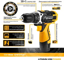 Аккумуляторная дрель-шуруповерт DEKO DKCD12FU-Li 063-4094 – незаменимый инструмент для сверления отверстий в металле и дереве. Удобство использования достигается за счет облегченной эргономичной формы и обрезиненной рукоятки. Эффективность сверления обеспечивается двумя скоростями: низкой и высокой.