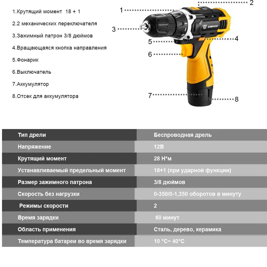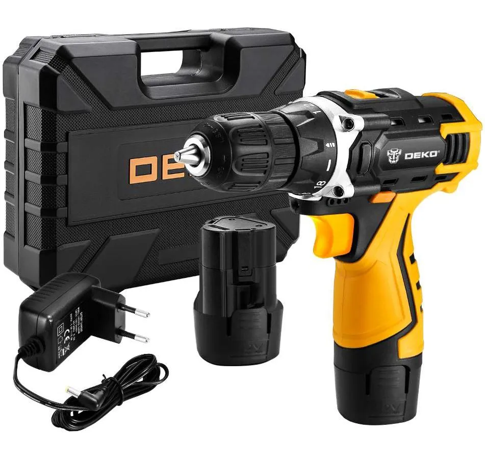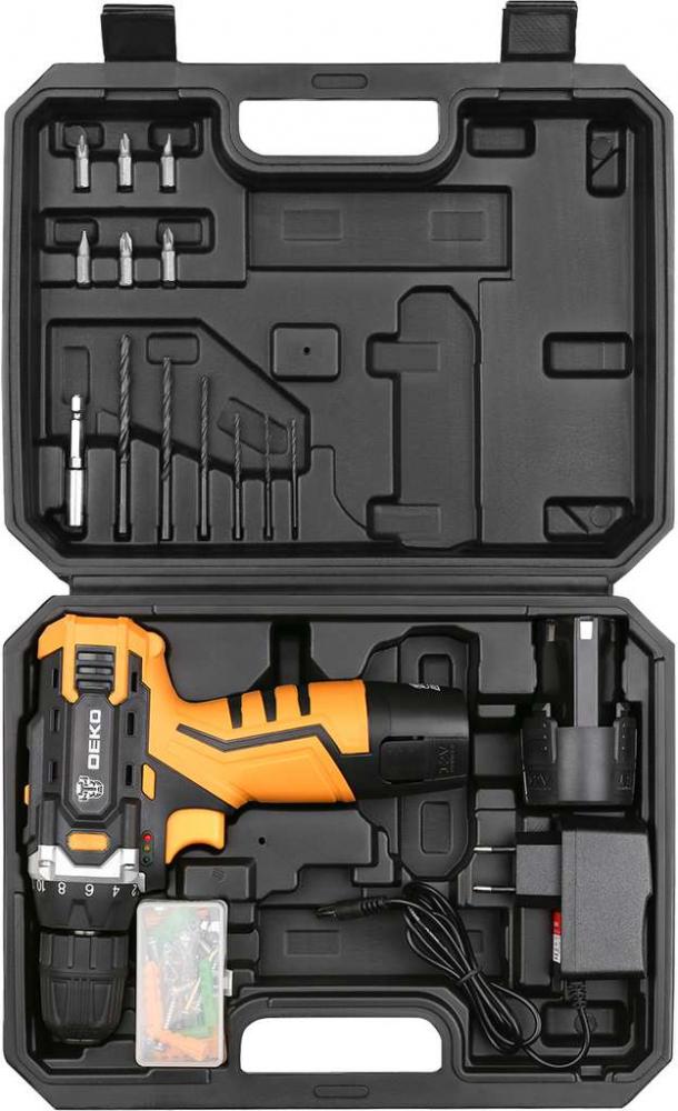 Описание товара Аккумуляторная дрель-шуруповерт DEKO DKCD12FU-Li в кейсе + набор 63 инструмента для дома, 12В, 2х2.0Ач