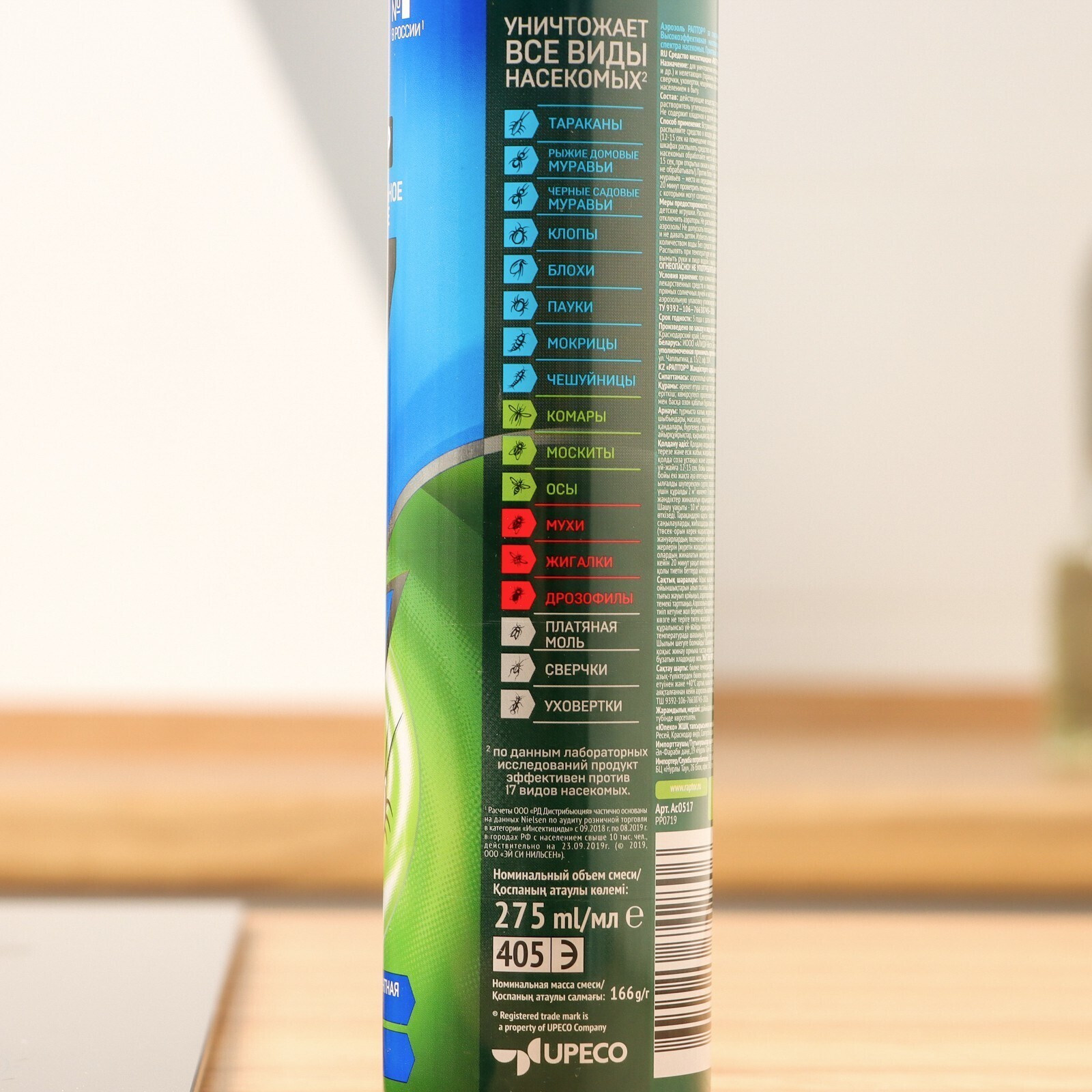 Три активных вещества разнонаправленного действия в составе. Эффективен против 17 видов ползающих и летающих насекомых, что подтверждено данными лабораторных исследований. Мгновенное действие. Не имеет аналогов на российском рынке.