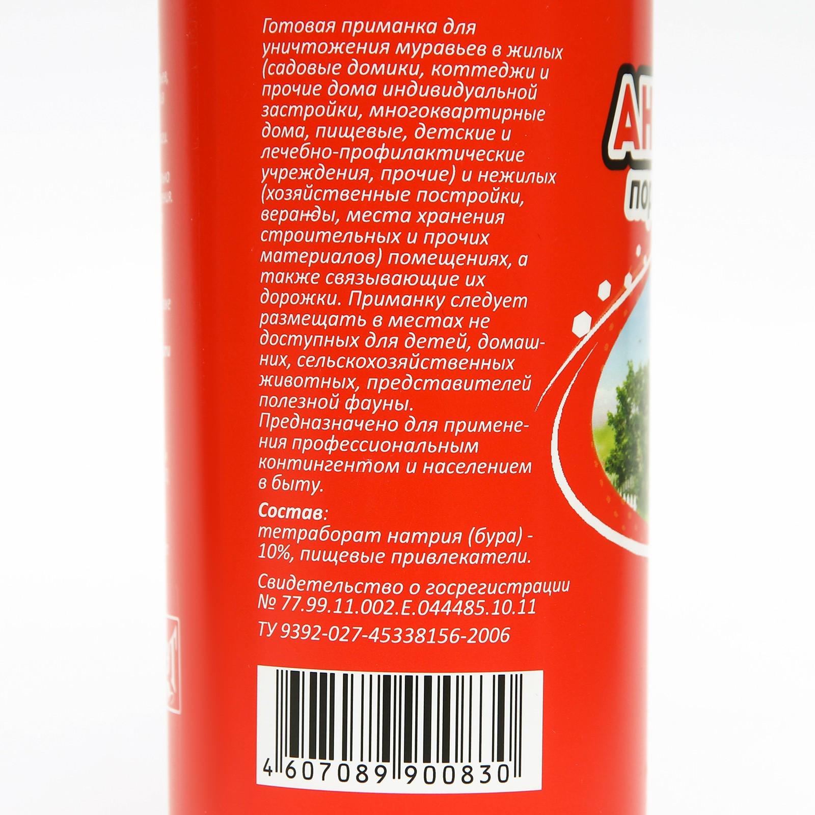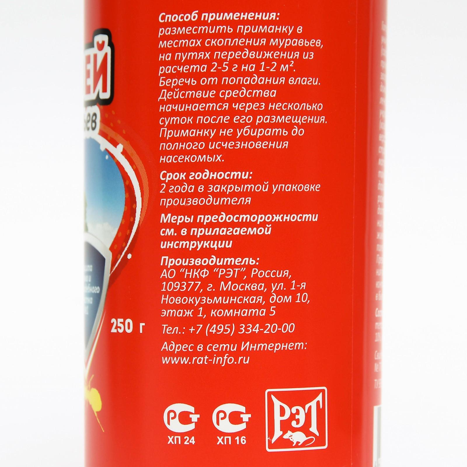 Способ применения: Размещать приманку в местах скопления муравьев, на путях передвижения из расчета 2 - 5 гр на 1-2 кв.м. При использовании в домашних условиях, рекомендовано наносить средство как можно дальше от места хранения пищевых продуктов. Требуется ограничить контакт средства с детьми и домашними питомцами.