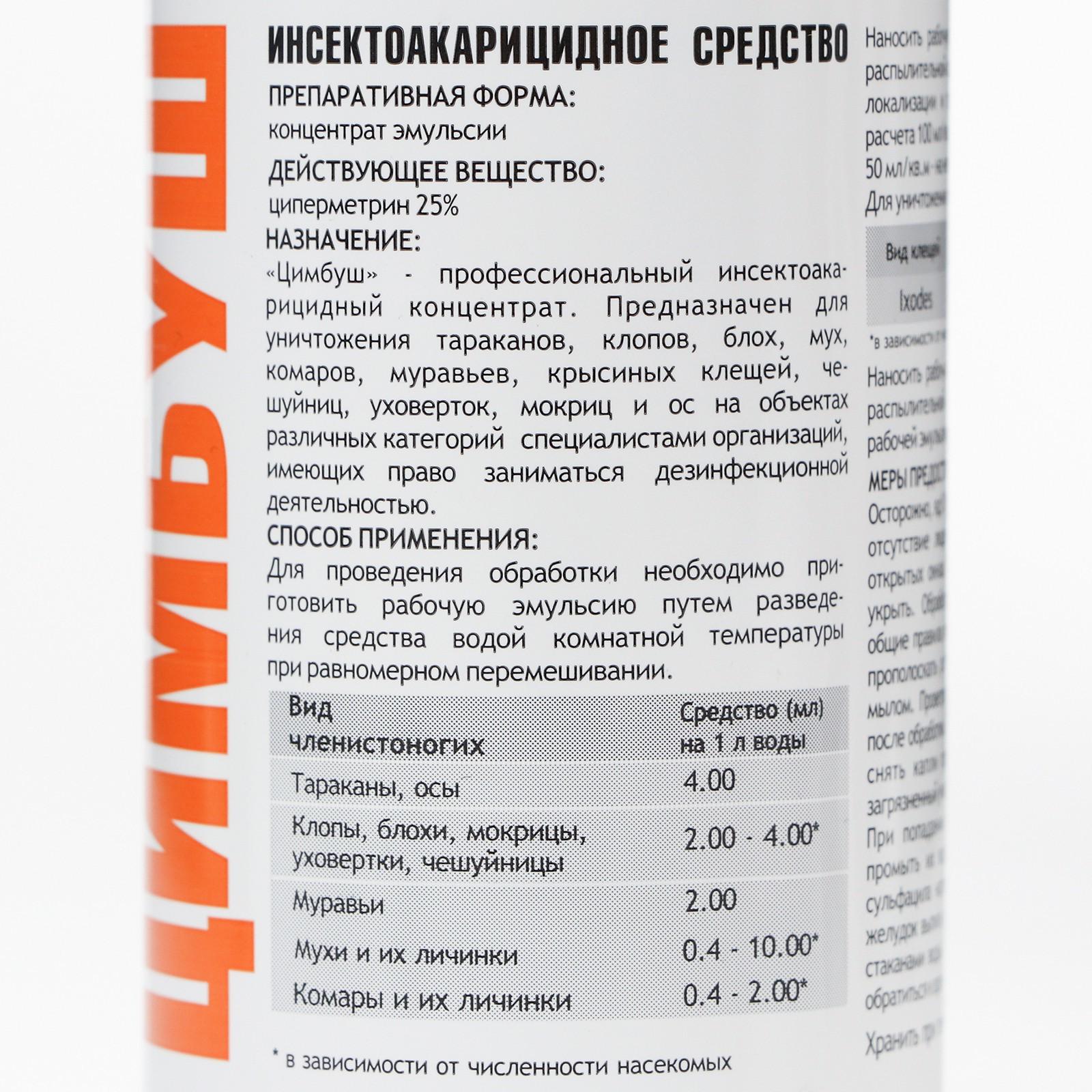 Цимбуш — эффективен в борьбе против таких видов членистоногих как: тараканы, муравьи, блохи, комары, мухи, крысиные клещи, так же рекомендован в борьбе с чешуйницами, уховертками, мокрицами и постельными клопами. Эмульгаторы введенные в рецептуру препарата образуют стабильную эмульсию, это обеспечивает более быстрый нок-даун эффект и уже через 2 минуты после использования вы будете наблюдать первую гибель вредителей