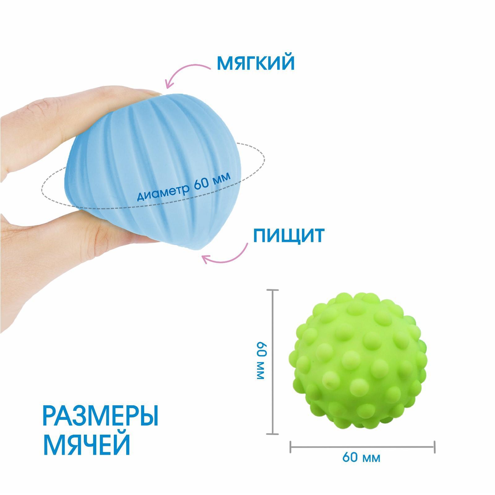 Мячики с рельефной массажной поверхностью способствуют развитию мелкой моторики и тактильных ощущений. Давление на фактурную поверхность мячиков стимулирует и благоприятно воздействует на нервные окончания, ответственные за большинство процессов в организме. Шарики имеют яркие цвета, которые способствуют развитию зрения, а пищалка внутри развивает слуховое восприятие.
