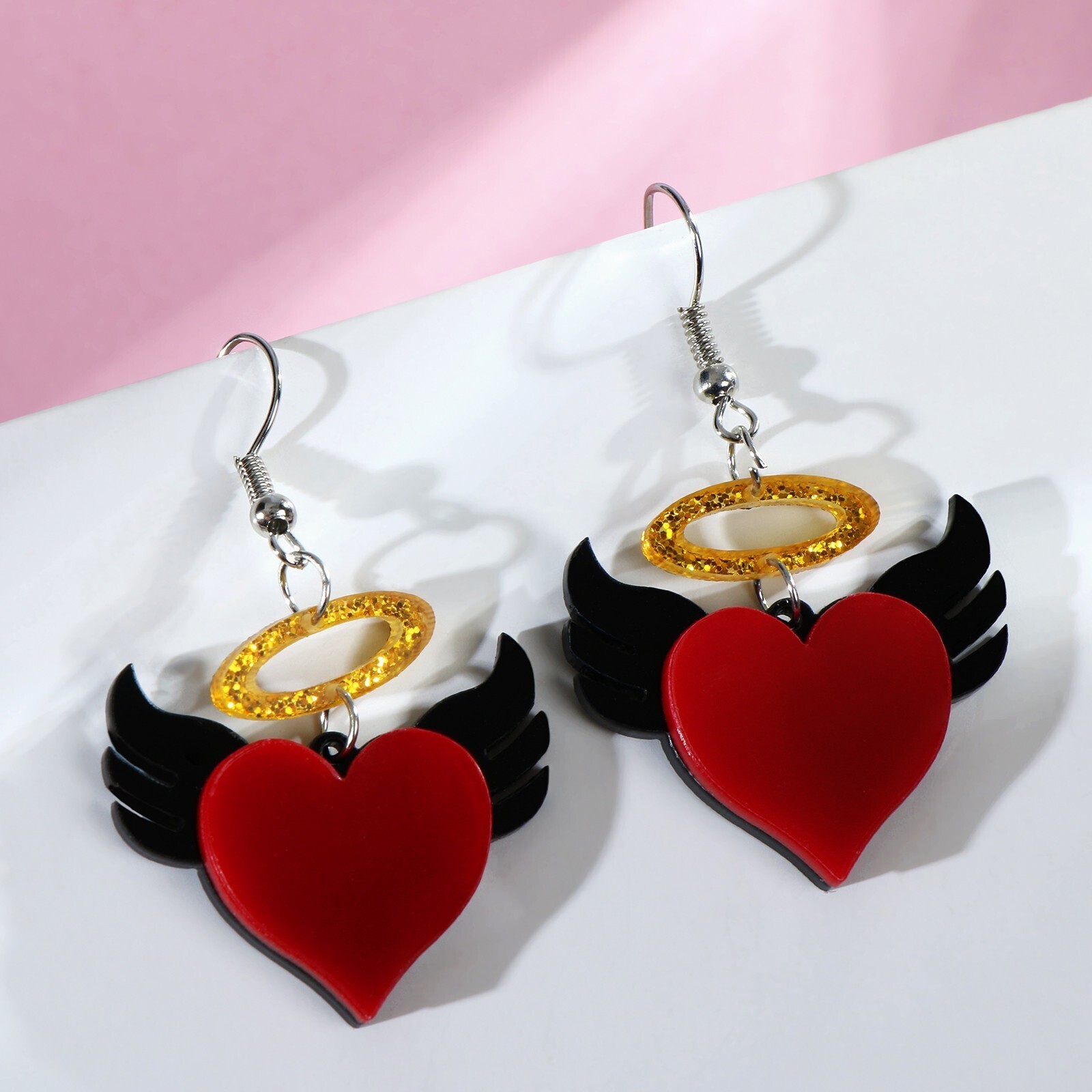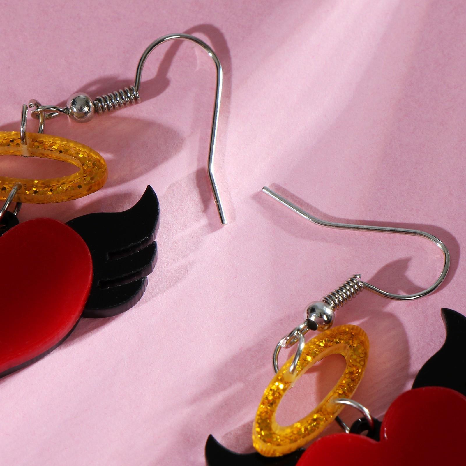 Серьги акрил "Сердца с крыльями" нимб, цвет красно-чёрный