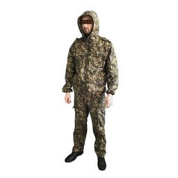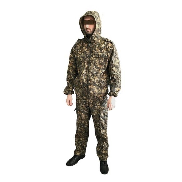 Куртка на молнии с капюшоном, низ куртки и рукава на резинке, 2 накладных кармана в области груди, 2 нижних боковых прорезных кармана, на левом рукаве карман с клапаном, погоны на плечах. Брюки прямые с отстроченными стрелками, пояс со шлевками под ремень, 4 кармана.