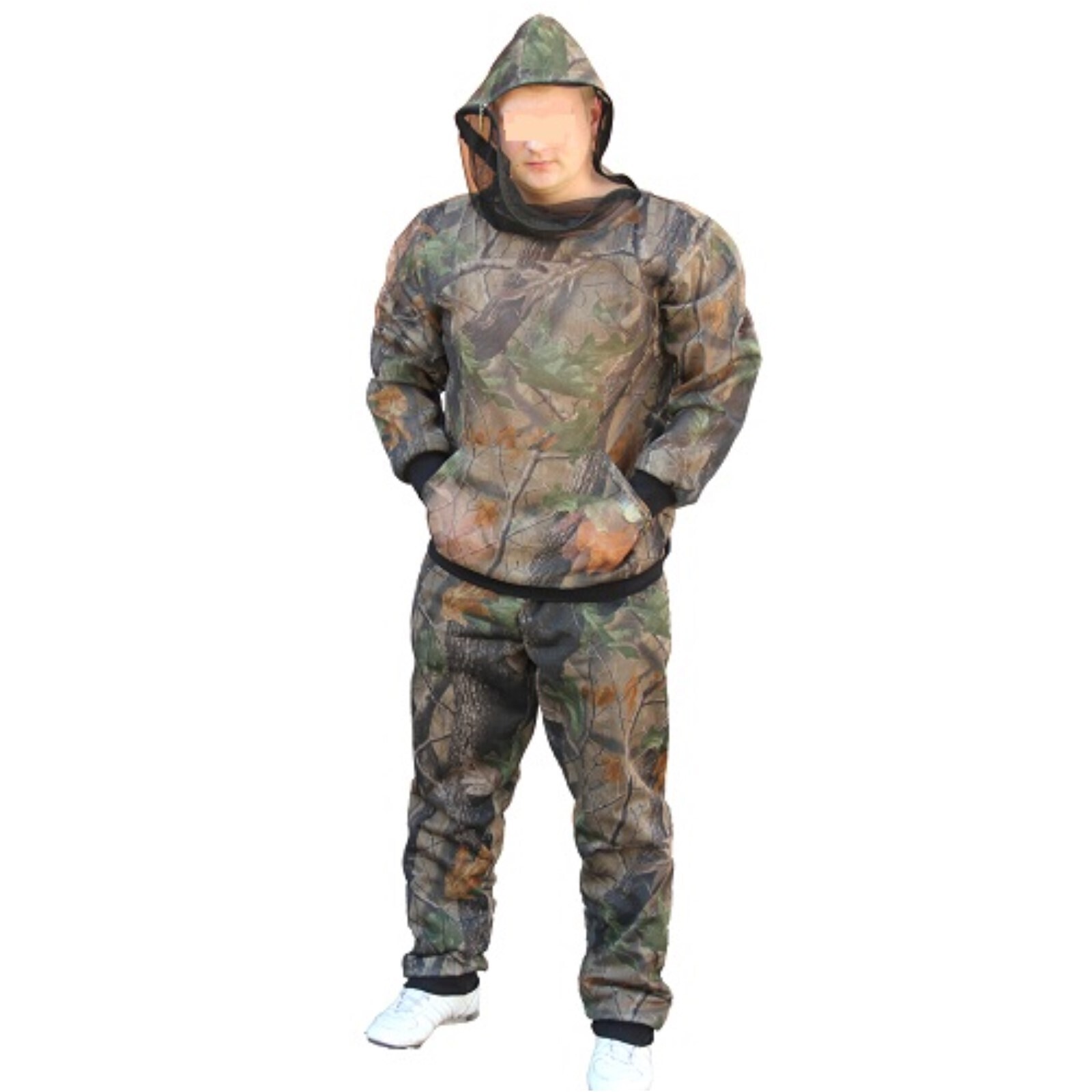 Костюм выполнен из двух видов сетки: наружная камуфлированная, внутренняя черная. Внизу куртки сдвоенный карман. Брюки на резинке. Рукава, низ куртки и брюк обработаны манжетой из лайкры. Поставляется в удобном мешочке-чехле.