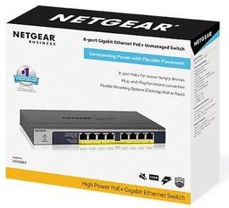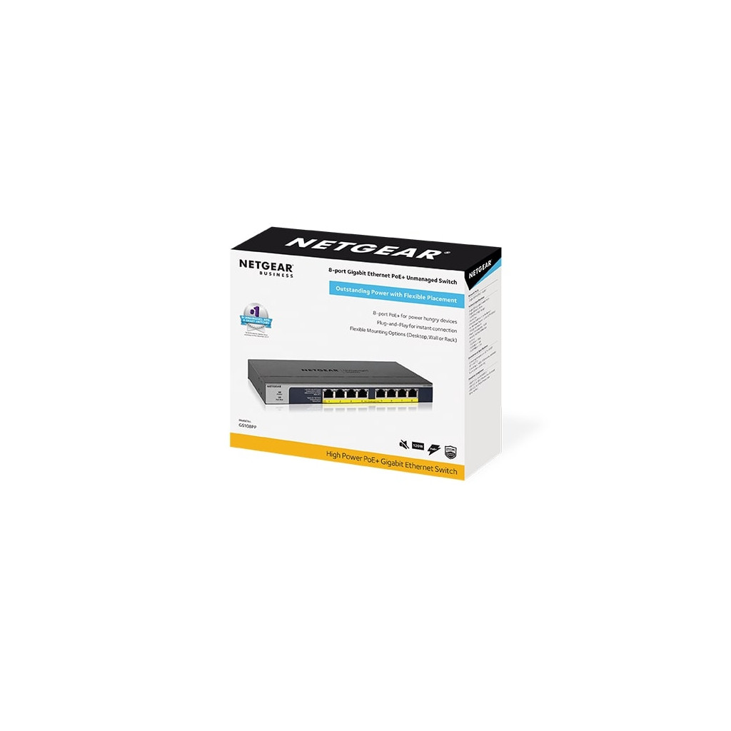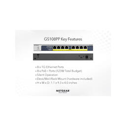 Некерований гігабітний комутатор N ETGEAR GS1 08PP з 8 портами PoE+ Gigabit Ethernet із загальним бюджетом потужності 123 Вт і фірмовою технологією автоматичного балансу потужності NETGEAR FlexPoE.