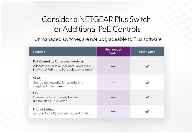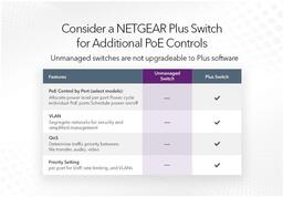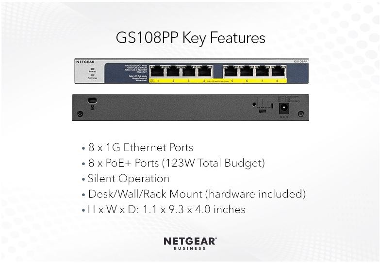 Некеровані комутатори NETGEAR серії GS1xxPP Gigabit Ethernet з підтримкою технології PoE/PoE+ допоможуть створити просту, надійну та доступну мережу для дому та невеликого офісу з можливістю під'єднання PoE-пристроїв. За допомогою цих легко під'єднуваних та автоматично настроюваних некерованих Plug-and-Play комутаторів ви можете легко розширити свою мережу, миттєво під'єднавши до кількох пристроїв.
