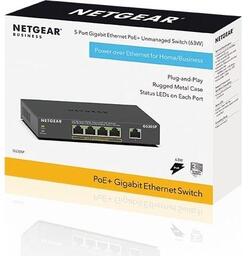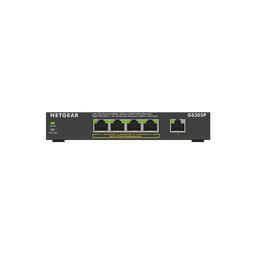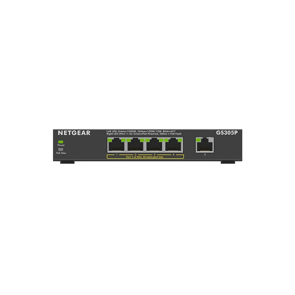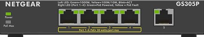 Гігабітний 5-портовий некерований комутатор NETGEAR GS305P Gigabit Ethernet SOHO з 4 портами PoE і бюджетом потужності 55 Вт для живлення бездротової точки доступу, IP-камер, IP-телефонів та ін. PoE пристроїв надає прості в керуванні, основні мережеві функції за доступною ціною для малого та середнього бізнесу.