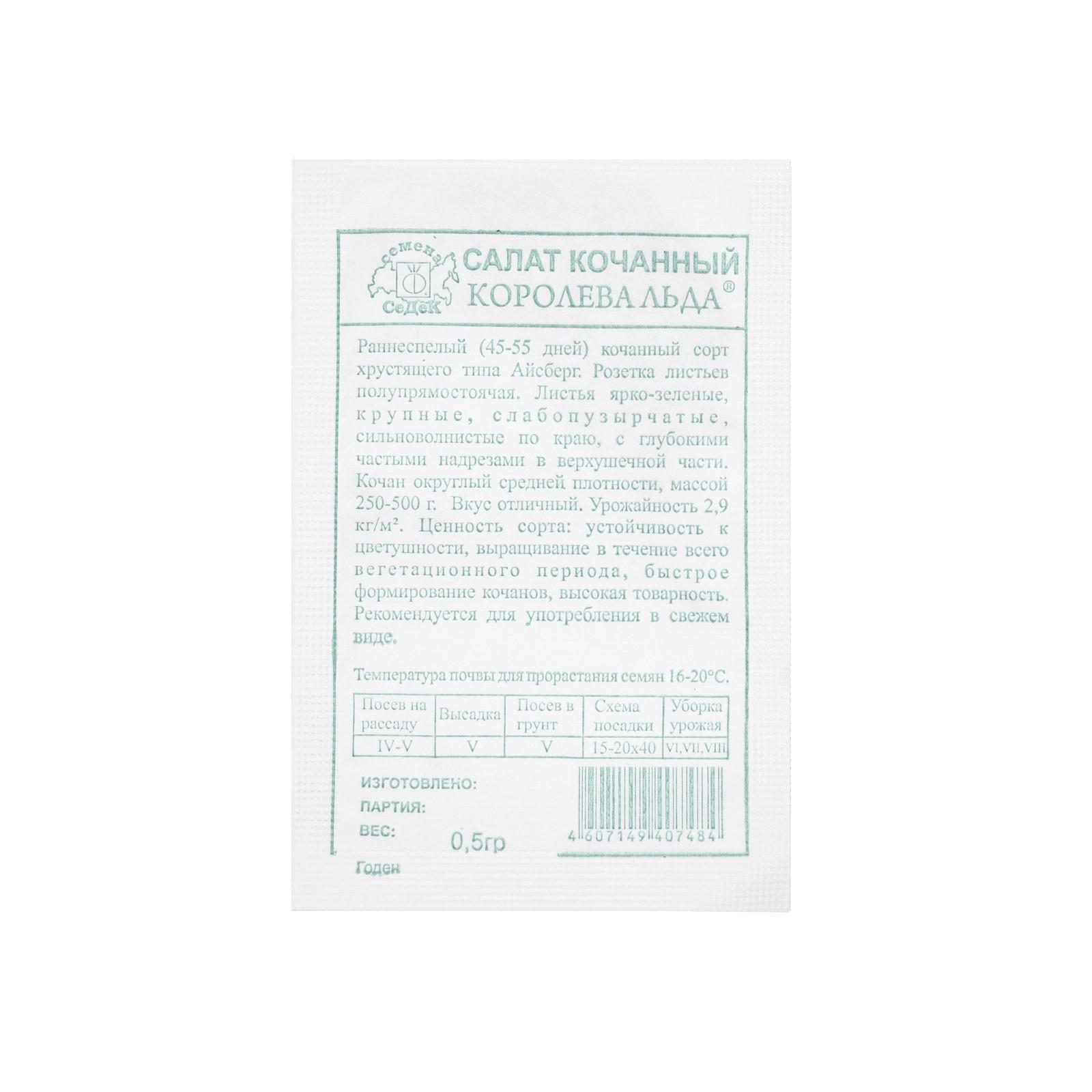 Раннеспелый (45-55 дней) кочанный сорт хрустящего типа Айсберг. Розетка листьев полупрямостоячая. Листья ярко-зеленые, крупные, слабопузырчатые, сильноволнистые по краю, с глубокими частыми надрезами в верхушечной части. Кочан округлый средней плотности, массой 250-500 г. Вкус отличный. Урожайность 2,9 кг/м².