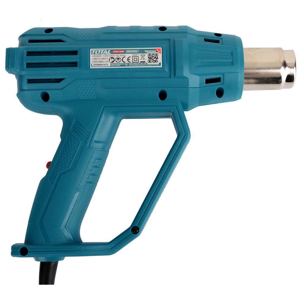 Будівельний фен TOTAL TB200365 є незамінним інструментом у випадках, коли потрібно прогріти різні поверхні перед очисткою або нанесенням на них покриттів, коли необхідно висушити поверхню або розплавити матеріал. Потужність моделі TOTAL TB200365 становить 2000 Вт, що дозволяє фену прогрівати повітря до температури 350-550 °С з продуктивністю 300-500 літрів на хвилину. У комплект поставки входить фен та одна насадка, інструкція і гарантійний талон.
