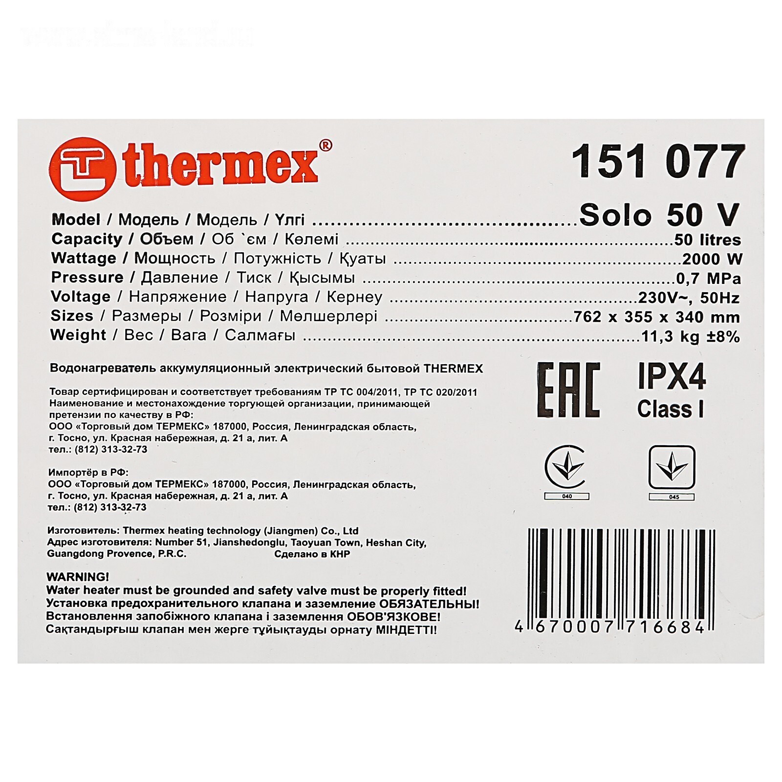 Водонагреватель Thermex Solo 50 V, накопительный, 2 кВт, 50 л, нерж. бак, белый