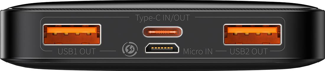 Емкость – 10000 mAh, электрохимическая система – Li-pol, источник заряда встроенной батареи – USB, интерфейсы подключения (выход) – USB Type-C, 2 х USB, материал корпуса – пластик, вес – 250 г, Цвет – черный