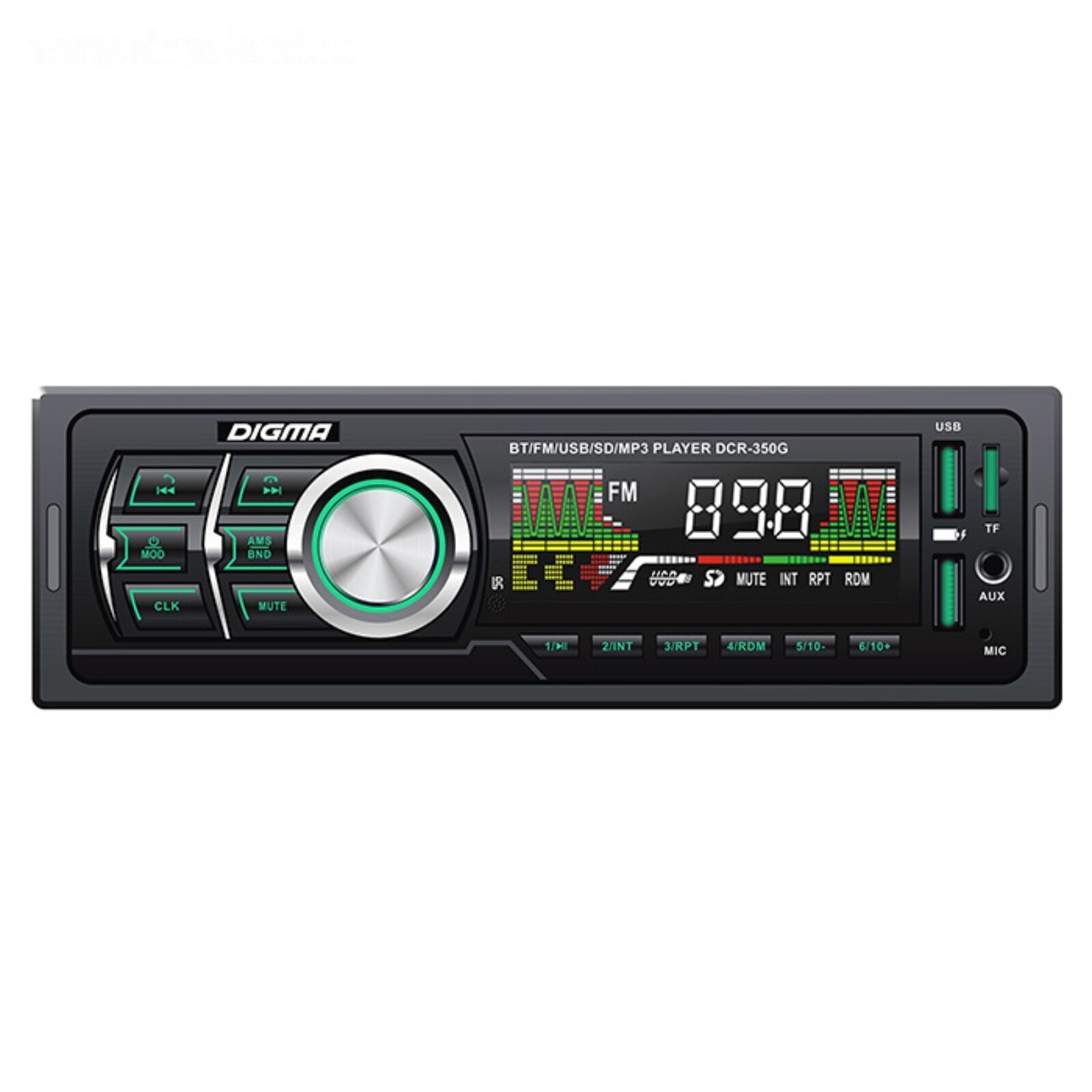Оборудование, которое открывает широкие возможности для прослушивания аудио-файлов, автомагнитола DIGMA DCR-350G. Производитель дает гарантию 12 месяцев на свою продукцию, создана техника в Китае. Типоразмер устройства 1 din. Корпус выполнен в черном цвете, подсветка кнопок - зеленая. Возможно воспроизведение с устройств USB, которые вставляются во фронтальный порт USB. Поддерживается воспроизведение с карт памяти SD и MMC, они вставляются в специальный слот. Магнитола имеет тюнер для приема станций FM.