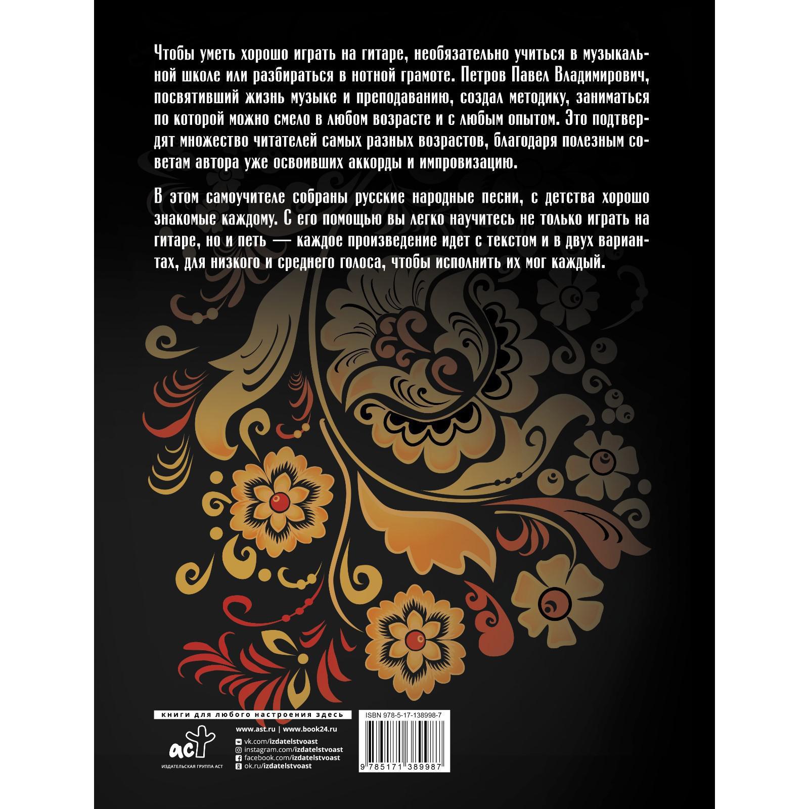 В этом самоучителе собраны русские народные песни, с детства хорошо знакомые каждому. С его помощью вы легко научитесь не только играть на гитаре, но и петь — каждое произведение идет с текстом и в двух вариантах, для низкого и среднего голоса, чтобы исполнить их мог каждый.