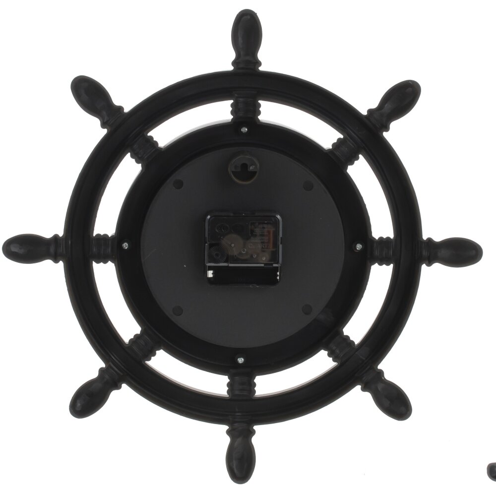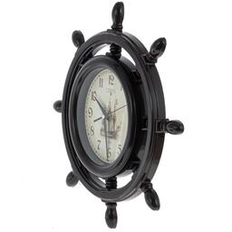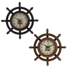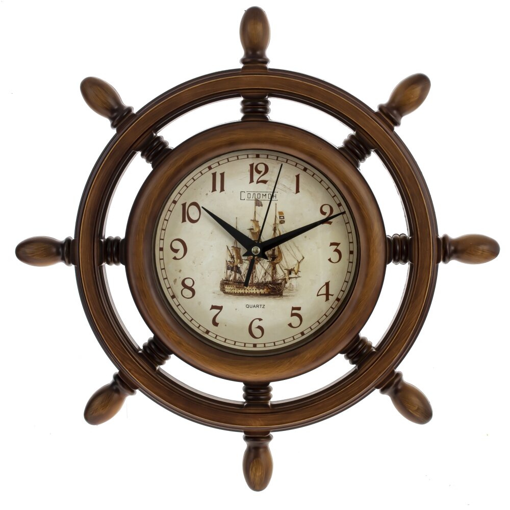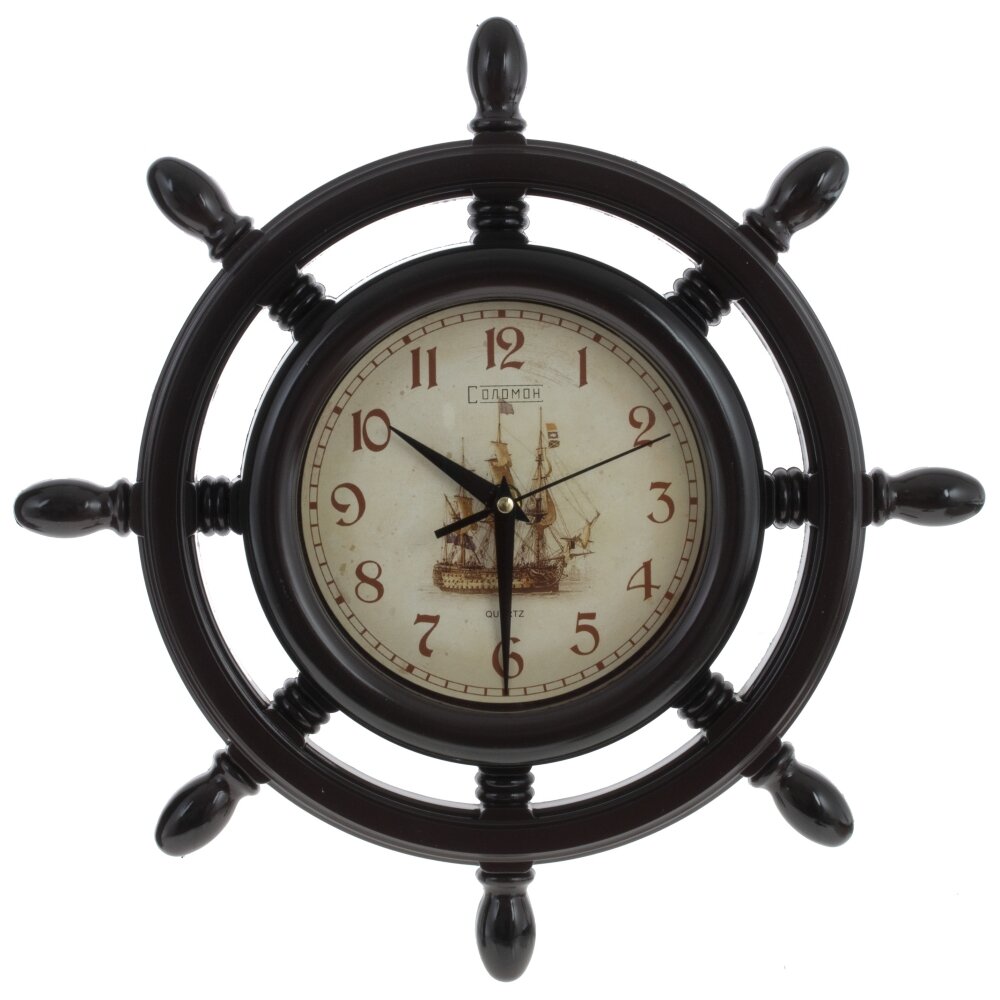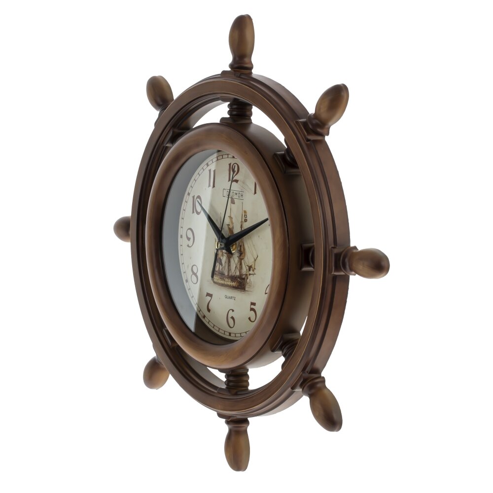Часы настенные в форме штурвала с декором в виде парусника отлично выглядят в интерьере и дополняют его. Циферблат круглый 15 см, с арабскими цифрами. Стрелки: часовая, минутная, секундная. Механизм: кварцевый. Питание: одна батарейка АА (не прилагается). Представлены в двух вариантах.