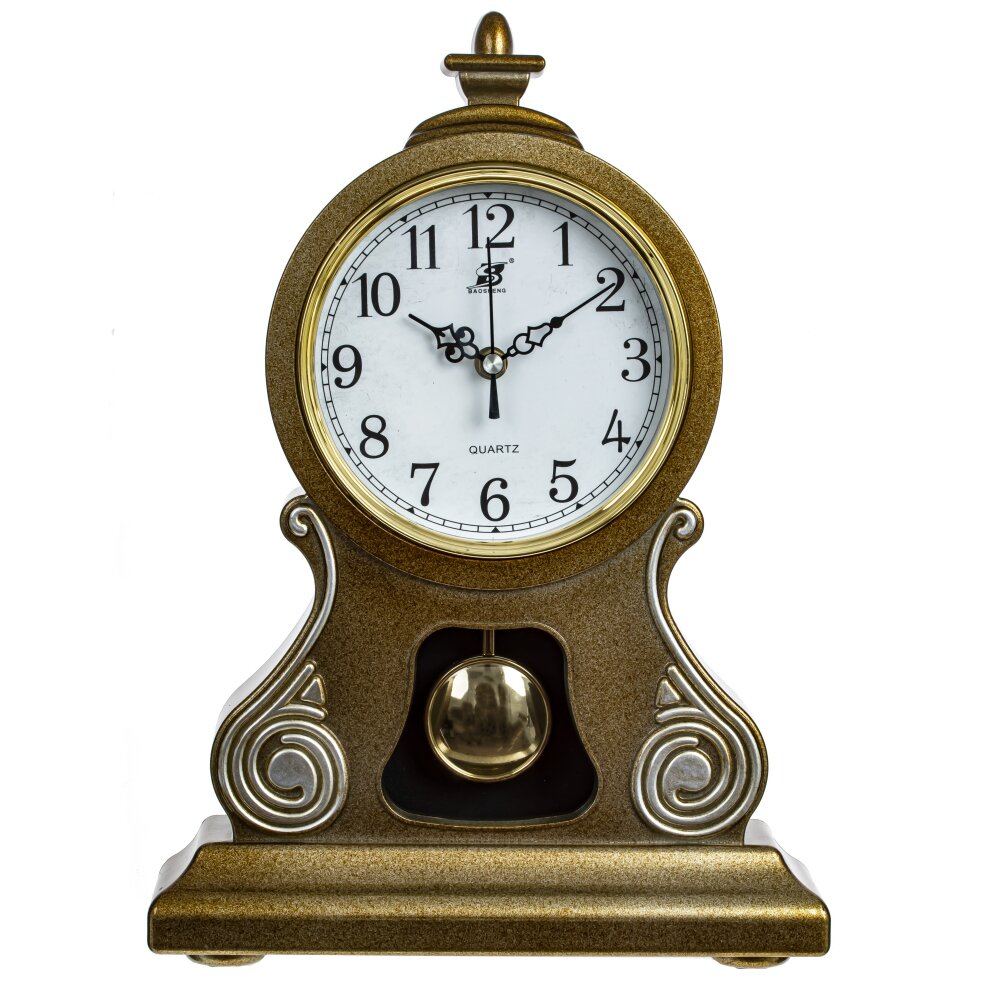 Стильные настольные часы с маятником прекрасно дополнят ваш интерьер. Циферблат диаметром 15 см, имеет три стрелки - часовая, минутная, секундная. Механизм - кварцевый. Цифры - арабские. Работают от 2 батареек типа "АА" ( в комплект не входят).