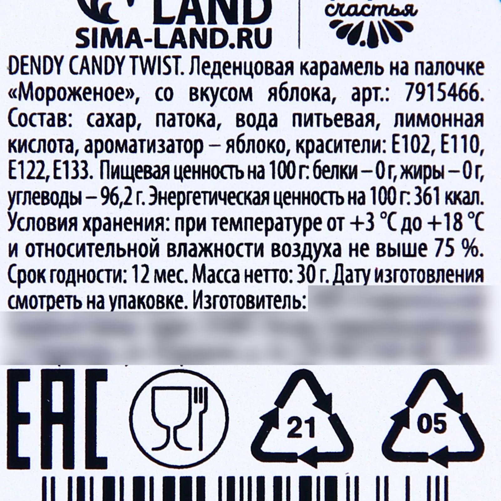 Состав: сахар, патока, вода питьевая, лимонная кислота, ароматизатор – яблоко, красители: Е102, Е110, Е122, Е133.
