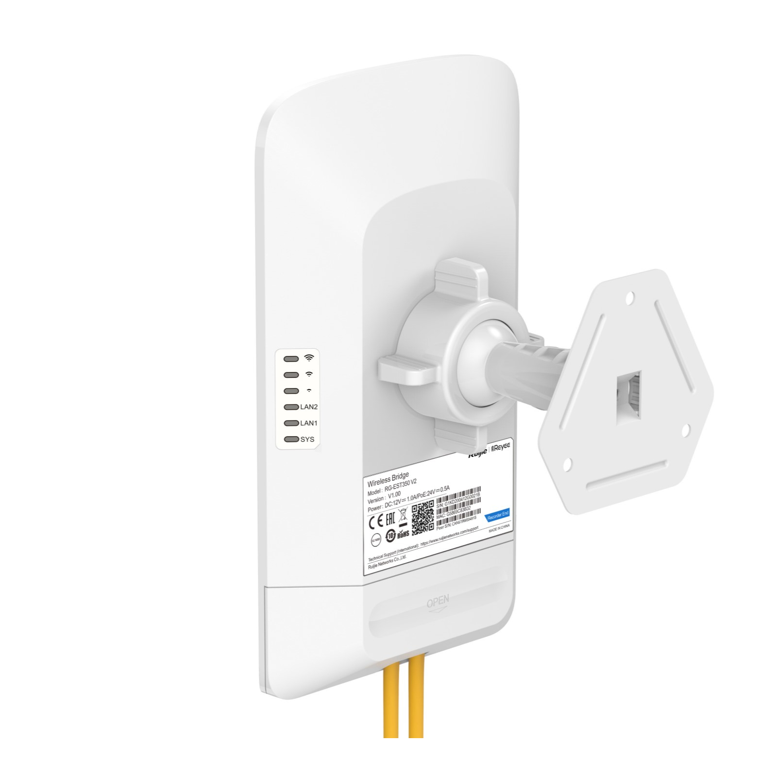 Ruijie Reyee Series RG-EST350 V2 — це бездротовий міст стандарту 802.11ac для транспортної мережі відеоспостереження або віддаленої бездротової передачі в таких сценаріях як баштові крани, фабрики, мальовничі місця, кампуси, посадкові бази, бази розведення акваферм і будівельні майданчики. Працюючи на частоті 5 ГГц, RG-EST350 підтримує два просторові потоки (технологія 2x2 MIMO) та забезпечує пропускну здатність до 867 Мбіт/с, що може повністю задовольнити вимоги до смуги пропускання каналу передачі даних для різних сервісів.