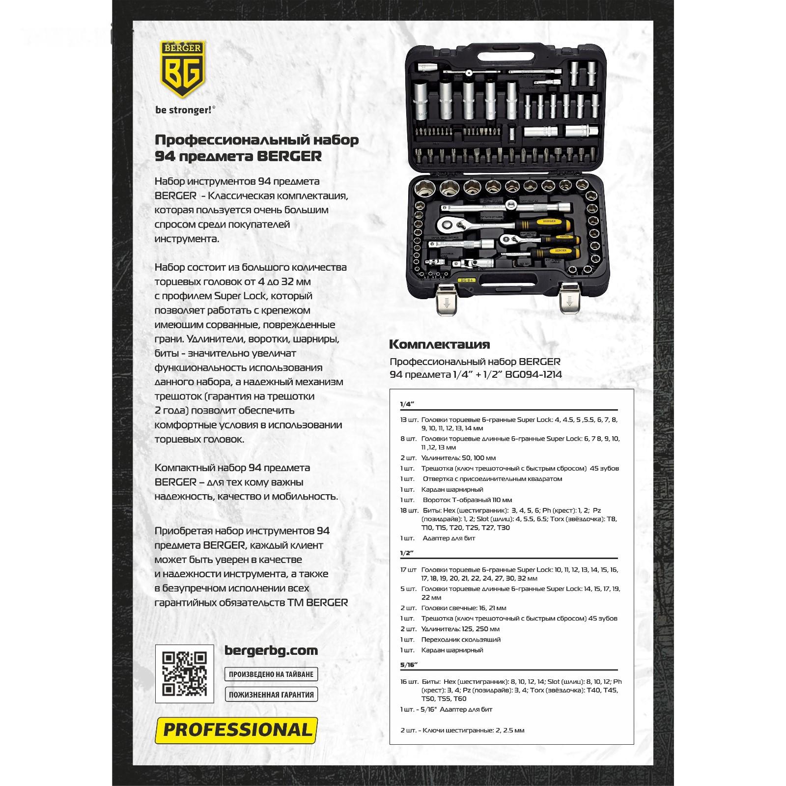 Набор инструментов BERGER BG094-1214, универсальный, 1/2", 1/4", 94 предмета, кейс