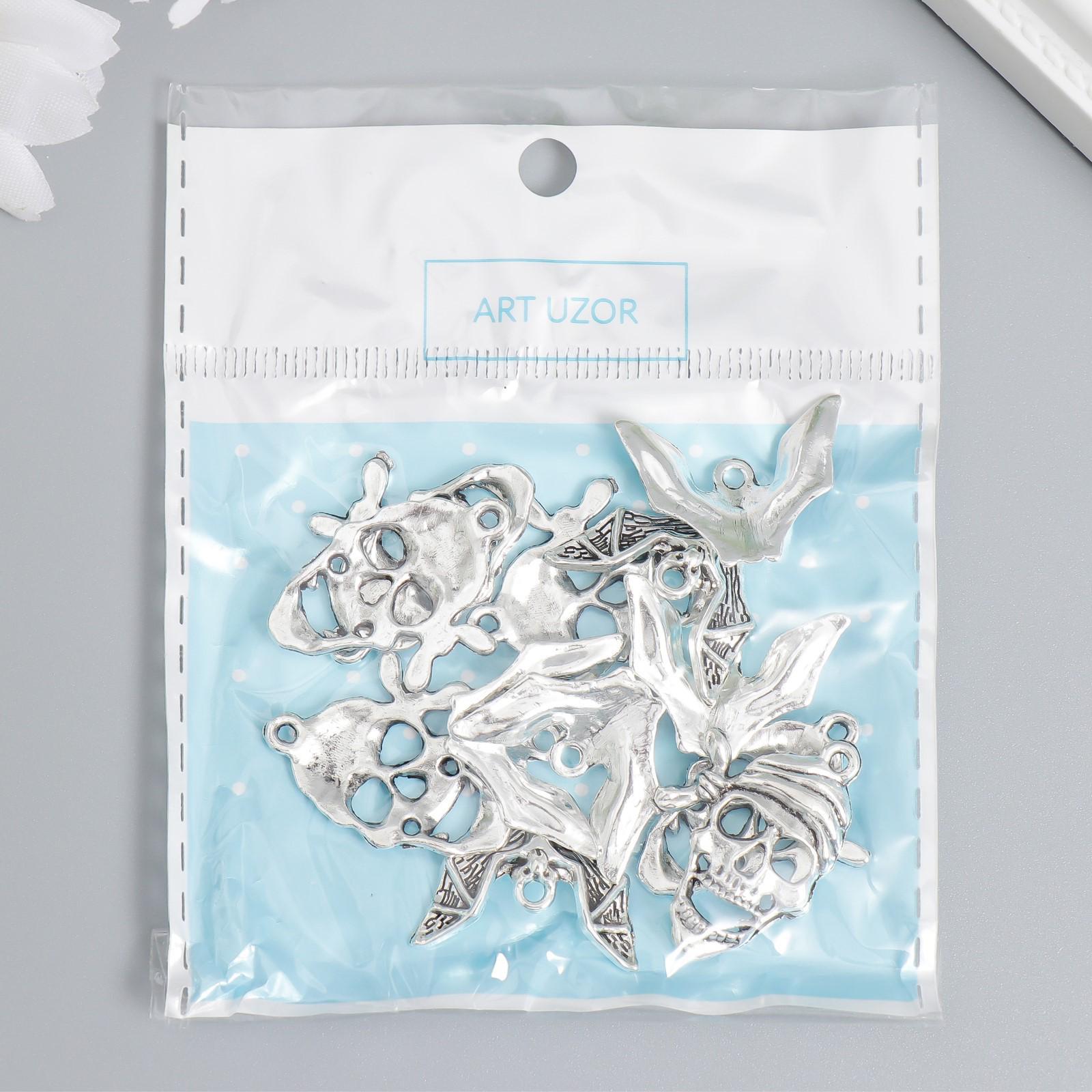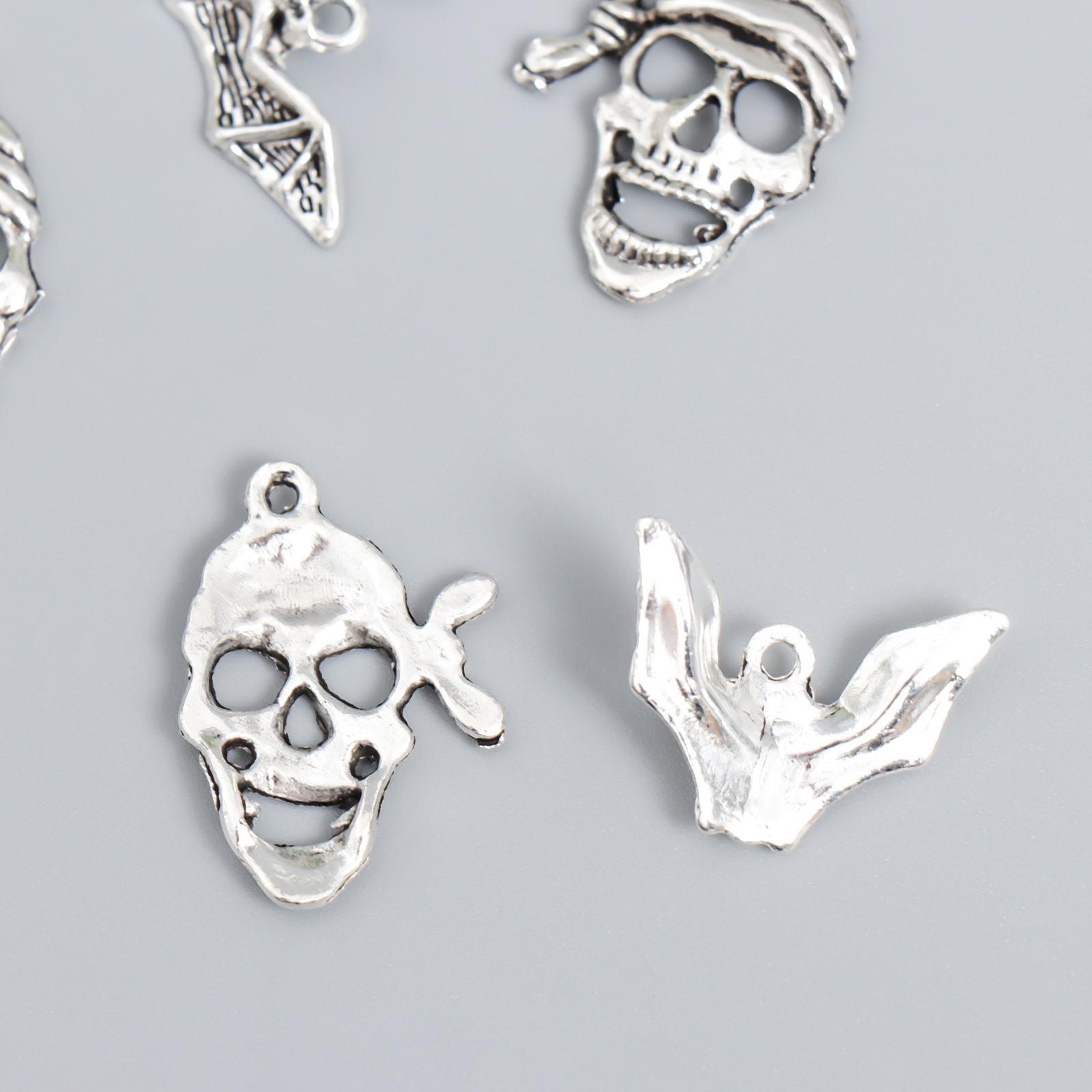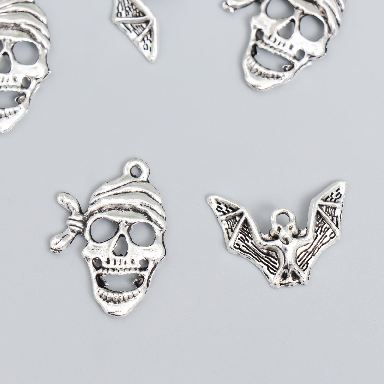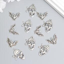 Декор для творчества металл "Череп и летучая мышь" серебро набор 6+6 шт 1,6х2,3 2,7х1,9 см