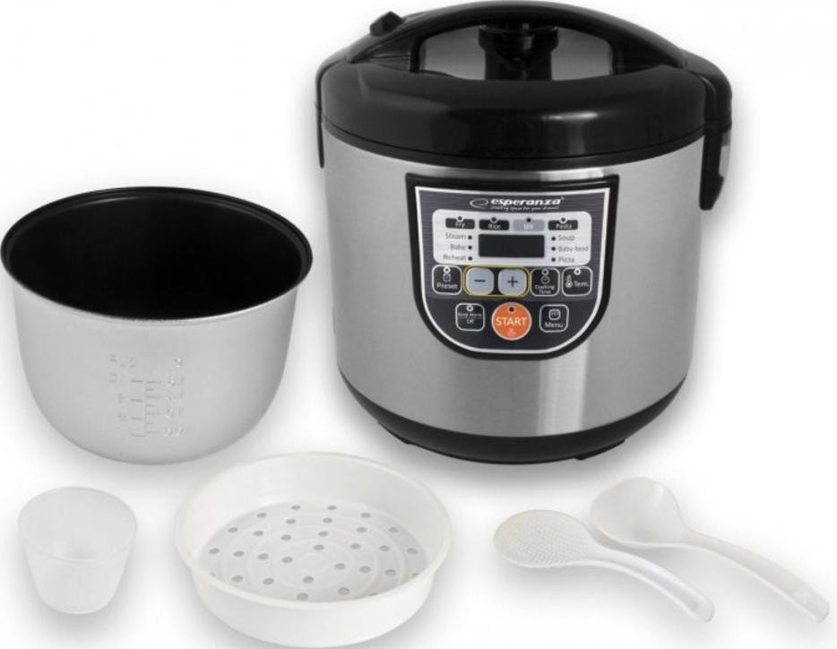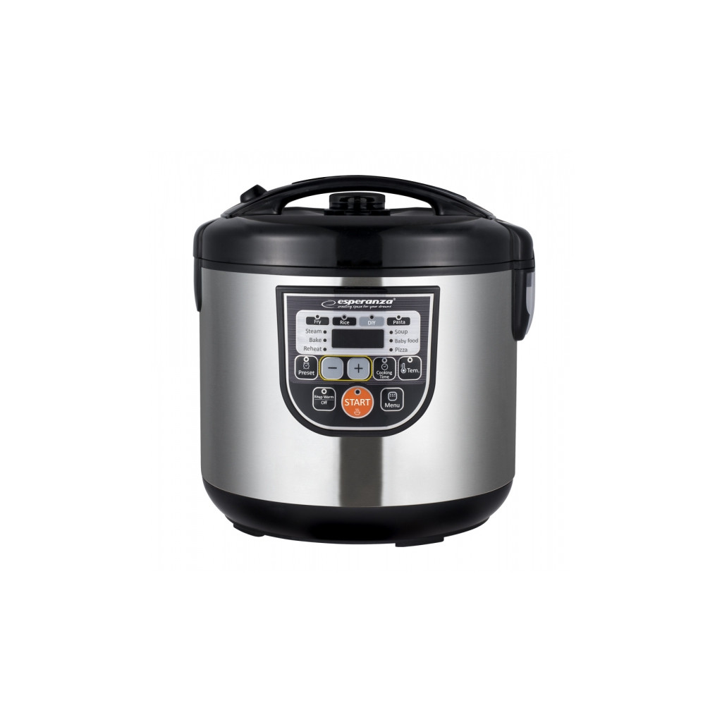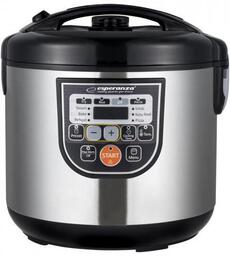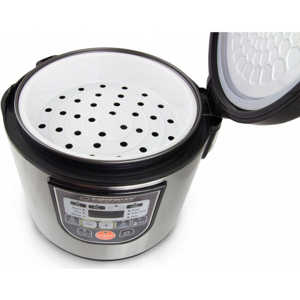Esperanza на 5 л EKG011 – гідна модель, що дозволяє значно удосконалити побут сучасної господарки. Її основна перевага та головна відмінна риса – наявність чималої кількості програм. Вона може приготувати навіть тушковане м'ясо, риба, овочі, рис, макарони, картопля, різну випічку. Esperanza на 5 л EKG011 має в комплектації 5-літрову чашу, черпак, мірну чашку та корисні пристрої. Для Вашої зручності та безпеки, в неї вбудований режим відстрочення старту, блокування кришки, захист від перегріву та нестачі води, автоматичне вимкнення. Має стильний сріблястий-чорний колір, зручна у використанні, компактна та багатофункціональна.