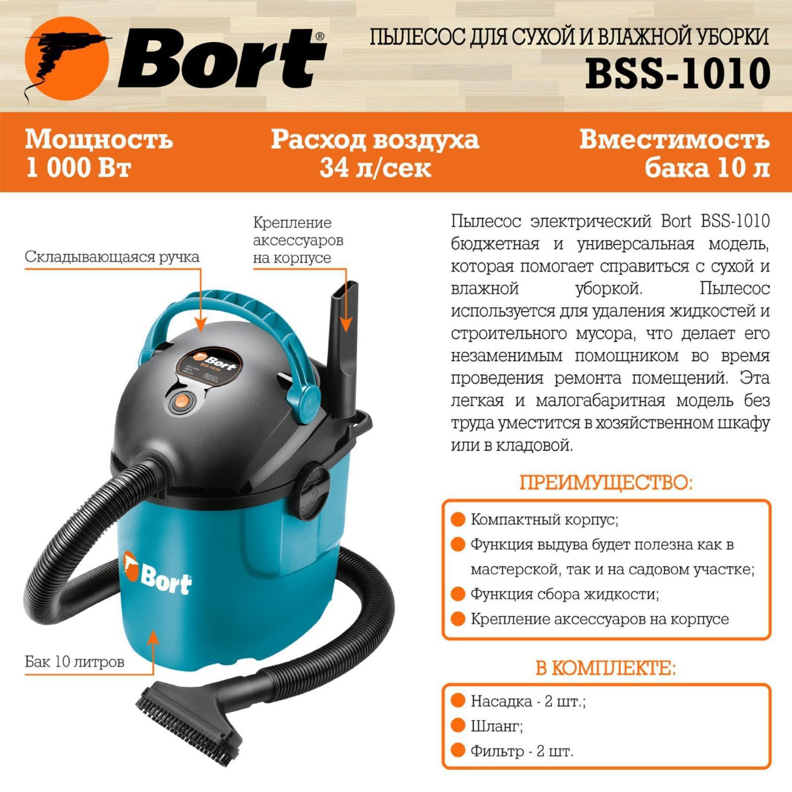 Самый компактный универсальный пылесос из серии Bort. Отлично подойдет для ремонта в квартире. Может убирать строительный мусор и жидкости. Нужно не забывать, что обычный пылесос от строительного мусора и пыли может сгореть. BSS-1010 имеет и функцию выдува воздуха. Надежный, высокоэффективный двигатель, с низким уровнем шума, создает большую силу всасывания. Пластиковый контейнер-мусоросборник легко снимается и просто чистится. Насадки к пылесосу хранятся в специальных нишах на корпусе пылесоса и не занимают лишнего места. В комплекте две насадки: простая со щеткой и щелевая для узких мест. Вес пылесоса всего 3 кг. Он не займет много места, его легко переносить и удобно чистить.