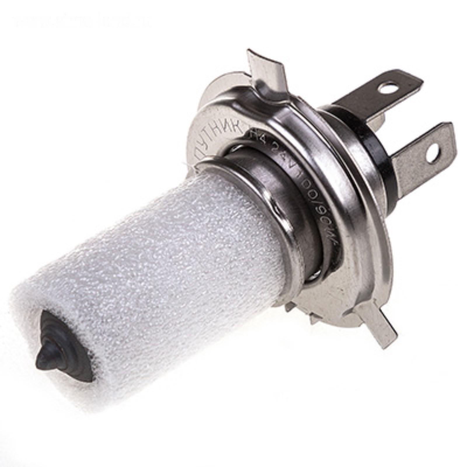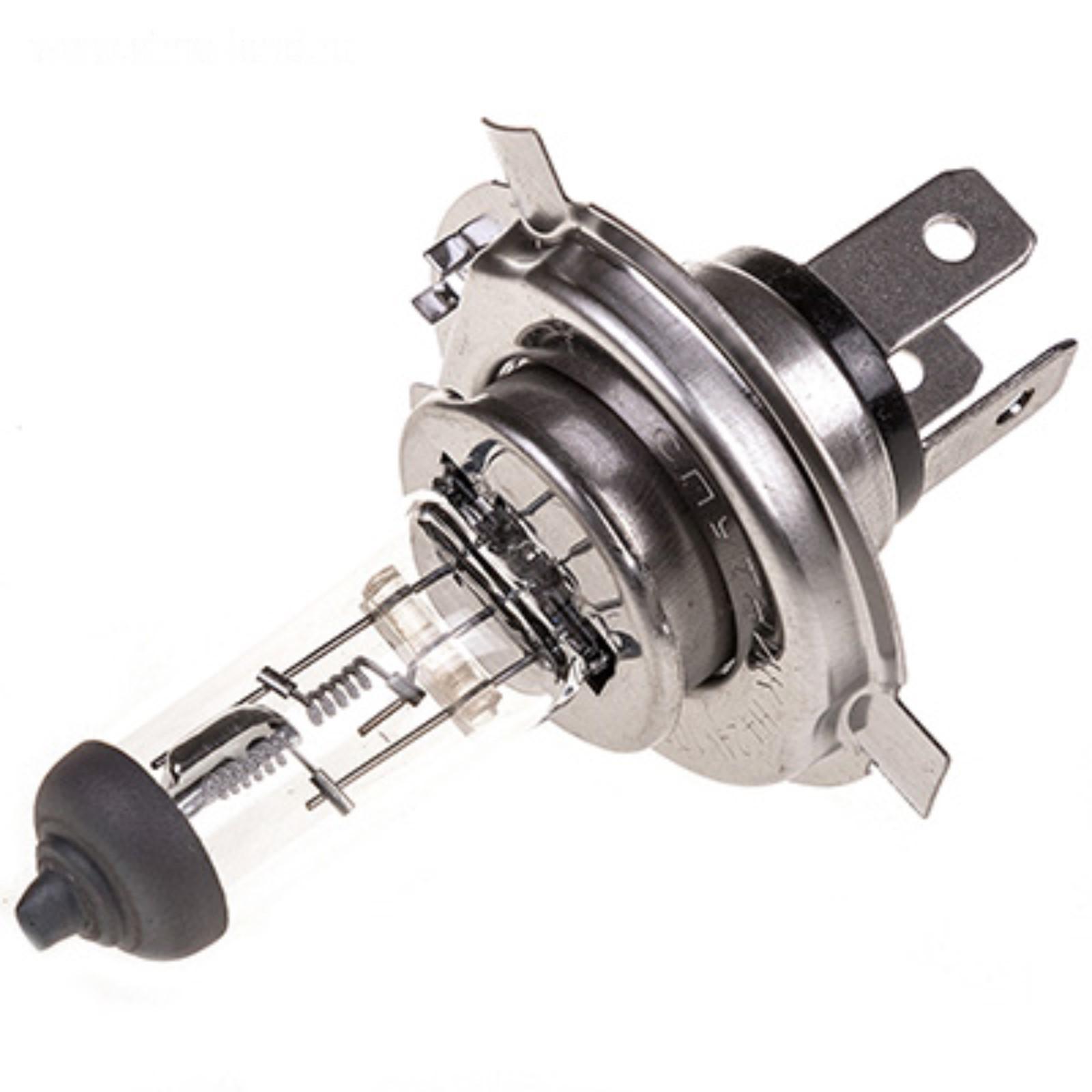 Галогеновая лампа накаливания головного света автомобиля. В автолампе две нити накаливания. Применяется для ближнего, дальнего света. Лампа H4будет служить Вам в течении довольно длительного времени. Лампы имеют две нити, внутри имеется металлическая пластинка, которая закрывает часть света выделяемого нитями. За счет этого фары не слепят встречный транспорт в темное время суток.