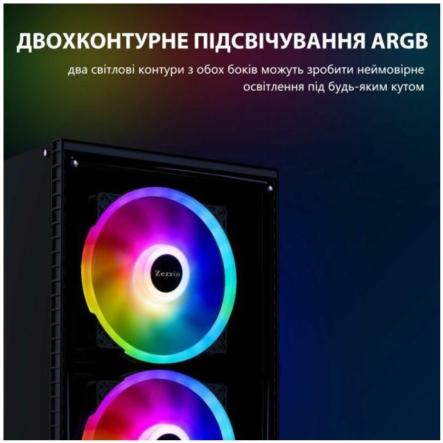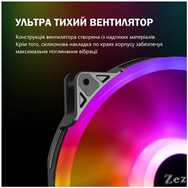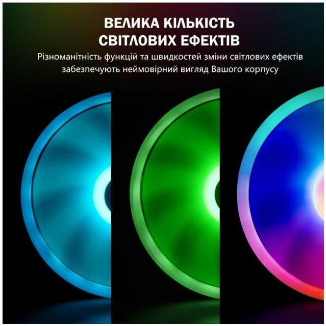 Досконала новий і прогресивний дизайн вентилятора з двоконтурним світінням, цілих 12 яскравих керованих ARGB світлодіодів знаходяться в центрі крильчатки і 24 керованих супер яскравих ARGB світлодіодів розташовані в зовнішньому світловому кільці корпусу вентилятора. Опануйте унікальні світлові ефекти світіння вентилятора і керуйте ними за допомогою програмного забезпечення материнської плати будь-якого виробника. Якщо у вашій материнській платі немає вбудованого контролера ARGB, вентилятор може працювати без керування, просто підключіть його до живлення.