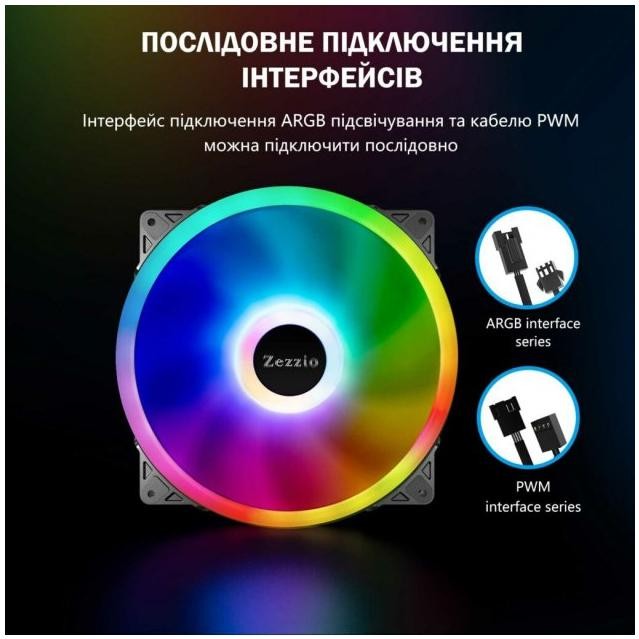 Вентилятори два послідовні роз’єми підключення: один роз’єм 4Пін PWM, другий ARGB 5В 3Пін. Для підключення ще одного вентилятора до одного ланцюга більше непотрібно використовувати додаткові перехідники або інтерфейси.