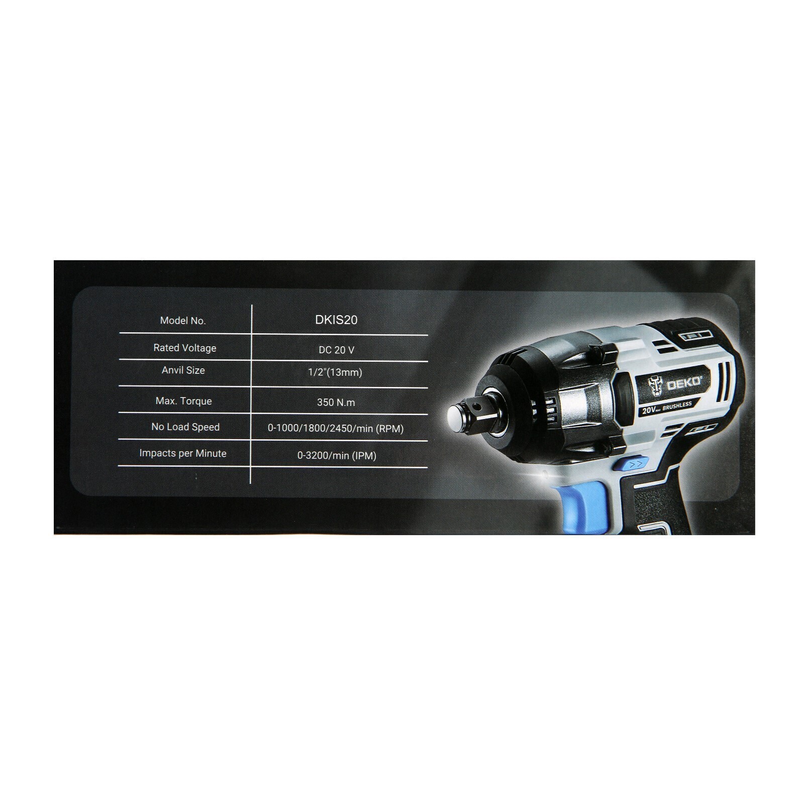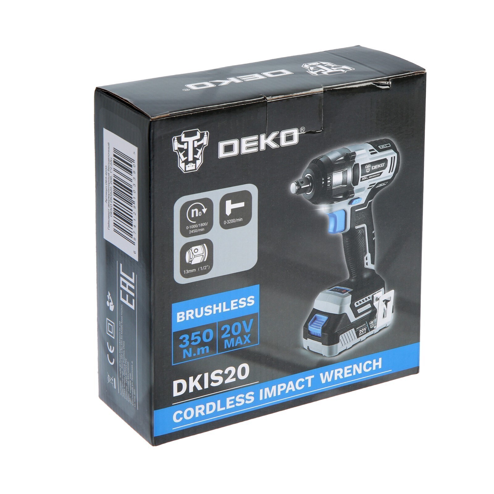 Гайковерт аккумуляторный бесщеточный DEKO DKIS20, 20В, 2 Ач, 350 Нм, 3200 уд/мин, 3 скорости